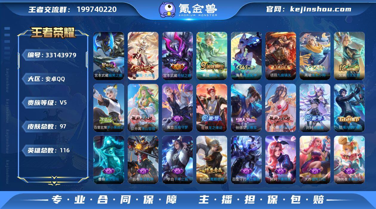 实名: 可修改 贵族等级: V5 英雄数: 116 皮肤数: 97 星传说: 幽冥之眼 传说皮: 地狱之眼 限定皮: 至尊宝,鸣野蒿,愿照·九州拓