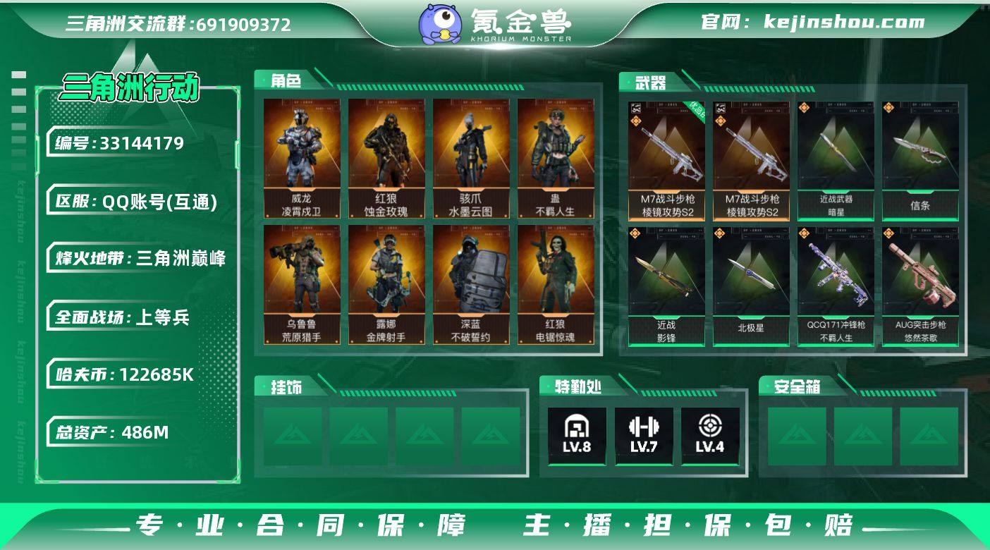 【土豪氪金号:高额资产486M+纯现金122M.三红皮+四刀皮+单典藏枪皮+六金皮】【饰金玫瑰+水墨云图+凌霄戍卫+北极星+暗星+信条+影锋+处刑者(3级)】【可二次】YXz6442-特勤处:仓库8级/靶场4级/训练中心7级-总资产486m-哈夫币122m-烽火等级:60级 【干员外观】:红狼-蚀金玫瑰,骇爪-水墨云图,威龙-凌霄戍卫,蜂医-送葬人·无题密令,深蓝-不破誓约,红狼-电锯惊魂,露娜-金牌射手,乌鲁鲁-荒原猎手,蛊-不羁人生 【近战皮肤】:近战-暗星,近战-北极星,近战-信条,近战-影锋,近战-处刑者3级,近战-黑鹰 【典藏外观】:M7战斗步枪-棱镜攻势S2 【典藏外观成色】:M7战斗步枪-棱镜攻势S2(优品B) 【传说外观】:M4A1突击步枪-蚀金玫瑰,M4A1突击步枪-阿米娅,AKM突击步枪-锦绣,QBZ95-1突击步枪-凌霄戍卫,ASh-12战斗步枪-鹅鸭杀,K416突击步枪-行动记录,AUG突击步枪-悠然茶歇,M7战斗步枪-怜悯,SG552突击步枪-运动员,AK-12突击步枪-特斯拉线圈,SCAR-H战斗步枪-水墨云图,SCAR-H战斗步枪-启航,G3战斗步枪-骑士,CAR-15突击步枪-阿米娅,腾龙突击步枪-捞点薯条,腾龙突击步枪-万金泪冠,K437突击步枪-锦绣,KC17突击步枪-电锯惊魂,MK47突击步枪-悠然茶歇,MK47突击步枪-暗...
