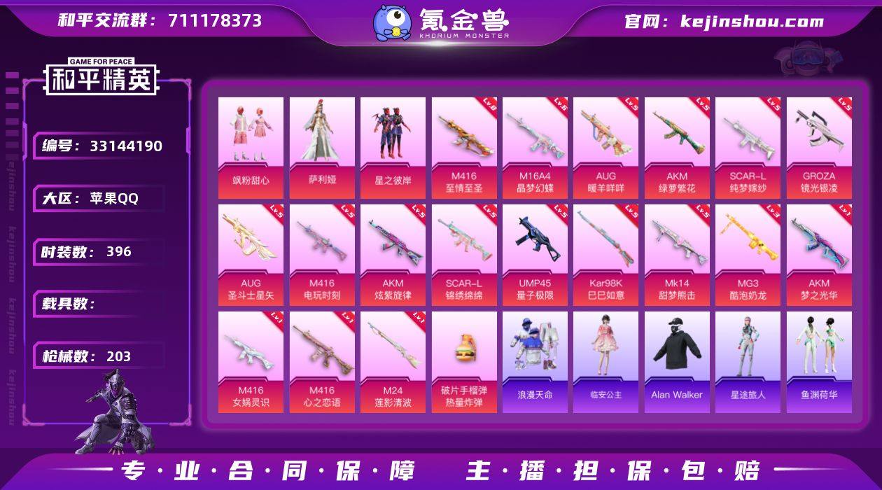 【特价出售】钱包不能注销钱包不能注销苹果Q-1稀有3粉装18特效枪4热门112套装203枪皮 63756热力值 8印记 历史卓越王牌13星 【1稀有】 浪漫天命 【3粉装】 萨利娅 飒粉甜心 星之彼岸 【18特效枪】 SCAR-L-纯梦嫁纱 (5级) SCAR-L-锦绣绵绵 (5级) M416-心之恋语 (1级) M416-电玩时刻 (5级) M416-女娲灵识 (1级) AKM-炫紫旋律 (5级) AKM-绿萝繁花 (5级) Kar98K-巳巳如意 (5级) MG3-酷泡奶龙 (3级) AUG-圣斗士星矢 (5级) AUG-暖羊咩咩 (5级) UMP45-量子极限 (5级) Mk14-甜梦熊击 (5级) GROZA-镜光银凌 (5级) M416-至情至圣 (8级) AKM-梦之光华 (1级) M24-莲影清波 (1级) 破片手榴弹-热量炸弹 (6级) 【4热门】 龟仙人 鹰眼刺客 梦之呓语 风华少年志 【1飞行器】 黄族统领飞行器 【1头盔】 百万伏特头盔 【2背包】 甜心宝贝背包 百万伏特背包