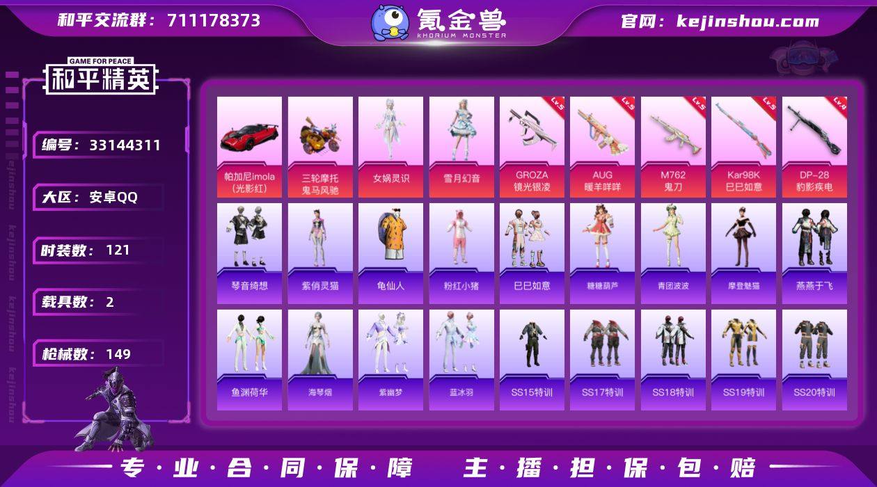 安卓 手Q-2粉装-5特效枪-2载具-2粉色飞行器-45924热力值-9王牌印记-121套装-149枪皮 【热门品类】:套装-龟仙人,套装-粉红小猪 【粉色套装】:角色-女娲灵识,粉装-雪月幻音 【粉色枪皮等级】:GROZA-镜光银凌(五级),AUG-暖羊咩咩(五级),M762-鬼刀(五级),Kar98K-巳巳如意(五级),DP-28-豹影疾电(四级) 【粉色载具】:帕加尼imola(光影红),鬼马风驰 【粉色枪皮】:GROZA-镜光银凌,AUG-暖羊咩咩,M762-鬼刀,Kar98K-巳巳如意,DP-28-豹影疾电 【粉色飞行器】:炫彩糖果飞行器,祥瑞起舞飞行器 【粉色降落伞】:银刃赛罗降落伞,垂柳戏鸭降落伞,纯梦嫁纱降落伞,玉鳞金羽降落伞,圣堂之誓降落伞,精灵梦叶罗丽降落伞,千金淑猫降落伞,炫彩糖果降落伞 【稀有套装】:套装-龟仙人,套装-巳巳如意,套装-炫彩糖果,套装-糖糖葫芦,套装-青团波波,角色-摩登魅猫,套装-燕燕于飞,套装-鱼渊荷华,角色-海琴烟,套装-紫幽梦,套装-蓝冰羽,角色-紫俏灵猫,套装-琴音绮想 【稀有枪皮】:AKM-影袭,AKM-破晓战魂,AKM-萌趣颜团子,AKM-虎虎生威,M16A4-幻世战舞者,M16A4-蓝色火焰,M16A4-千金淑猫,SCAR-L-玉兔迎春,M416-糯团青竹,M416-红色方程式,M416-绯红前夜,M416-蓝...