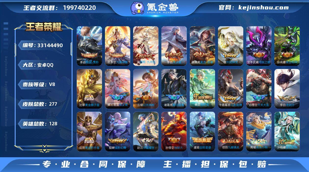0B89PG金标 妮可露露 可二次275皮肤水晶2打野号传说19优质限定10 信用分正常 钱包已注销 水晶皮肤:九霄神辉,鸣剑·曳影, 传说限定:凤求凰,前尘镜,齐天大圣,寅虎·赤拳,愿照·九州拓,鹤羽星尊,启明星使, 传说皮肤:幻光神枪,末日机甲-孙尚香,黄金射手座,黄金狮子座,淬星耀世,地狱之眼,诗剑行,地狱火,炽阳神光,猫影幻舞,久胜战神,鸣野蒿, 新史诗限定:涂山容容, 史诗限定:飞衡,时之祈愿-云中君, 新史诗皮肤:灵蛊蚀心,百相守梦-黄忠, 优质史诗皮肤:天秀·启明,晚萤,修罗,青蛇,魅语, 周年皮肤:李小龙,鹤鸣心笺,五谷丰年, 珍宝阁:妄想食味,女武神, 史诗皮肤:星夜王子,圣诞狂欢,末日机甲-吕布,无心,乘风破浪,幽灵船长,苍穹之光,功夫厨神,德古拉伯爵,水晶猎龙者,心灵战警,猫狗日记-孙策,未来纪元-赵云,节奏热浪,鬼剑武藏,千年之狐,紫霞仙子,暗隐猎兽者,冰冠公主,曙光守护者,原初追逐者,热力回旋,纤云弄巧,缤纷独角兽,金属风暴,女仆咖啡,摇滚巨星,暗夜贵公子,冰雪圆舞曲,圣诞恋歌,心灵骇客,偶像歌手,月团寄思,拒霜思,水果甜心,鹰眼统帅,逐浪之夏,特工魅影,天才门将,电玩·爆裂旋风,乱世虎臣,
