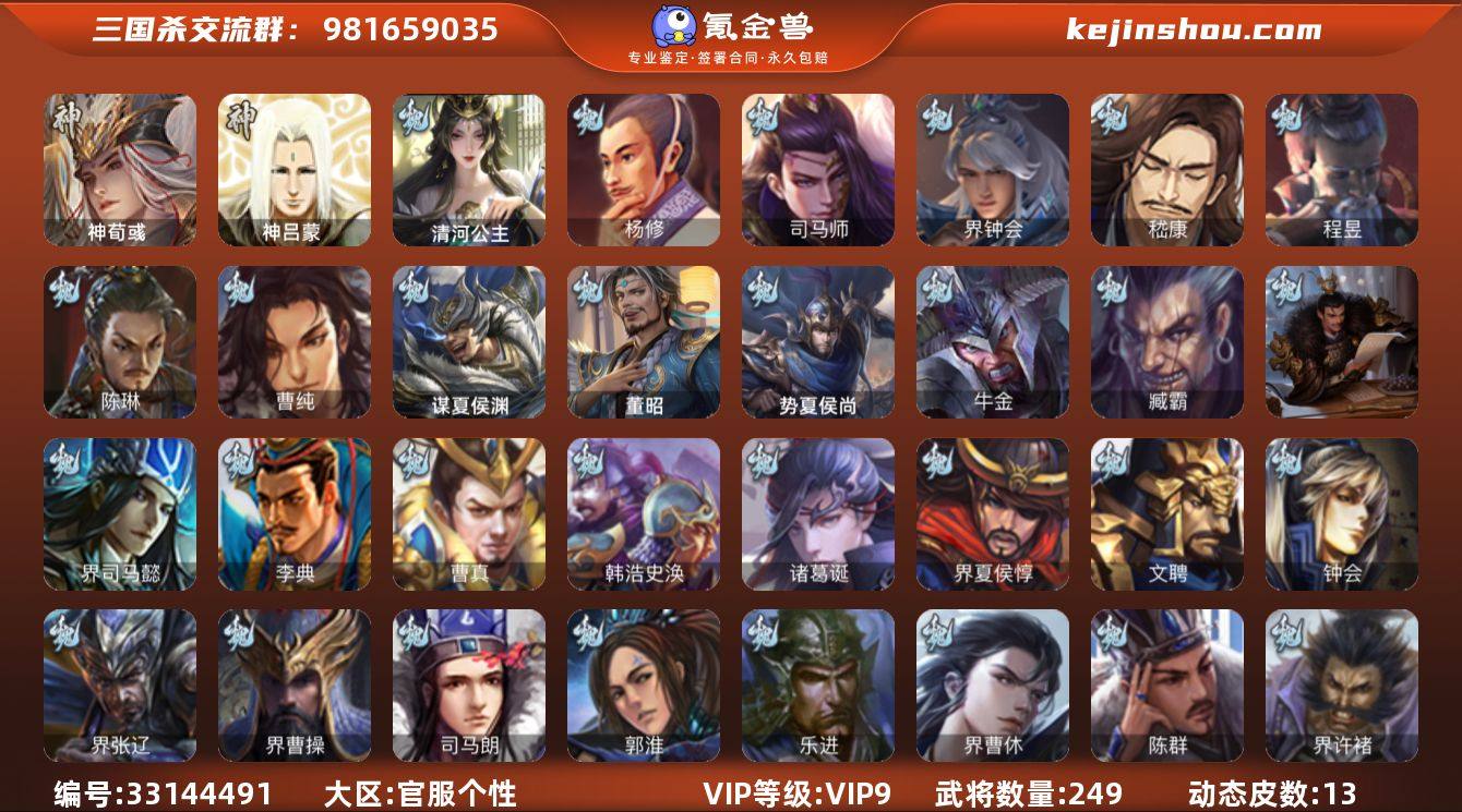 【14790038】官阶:骠骑将军;VIP等级:VIP9;史诗武将数量:17;动态皮肤数量:13;武将总数:249;史诗宝珠数量:1;将魂数量:3838;神将:1;魏国史诗武将:4;蜀国史诗武将:1;吴国史诗武将:3;群史诗武将:5