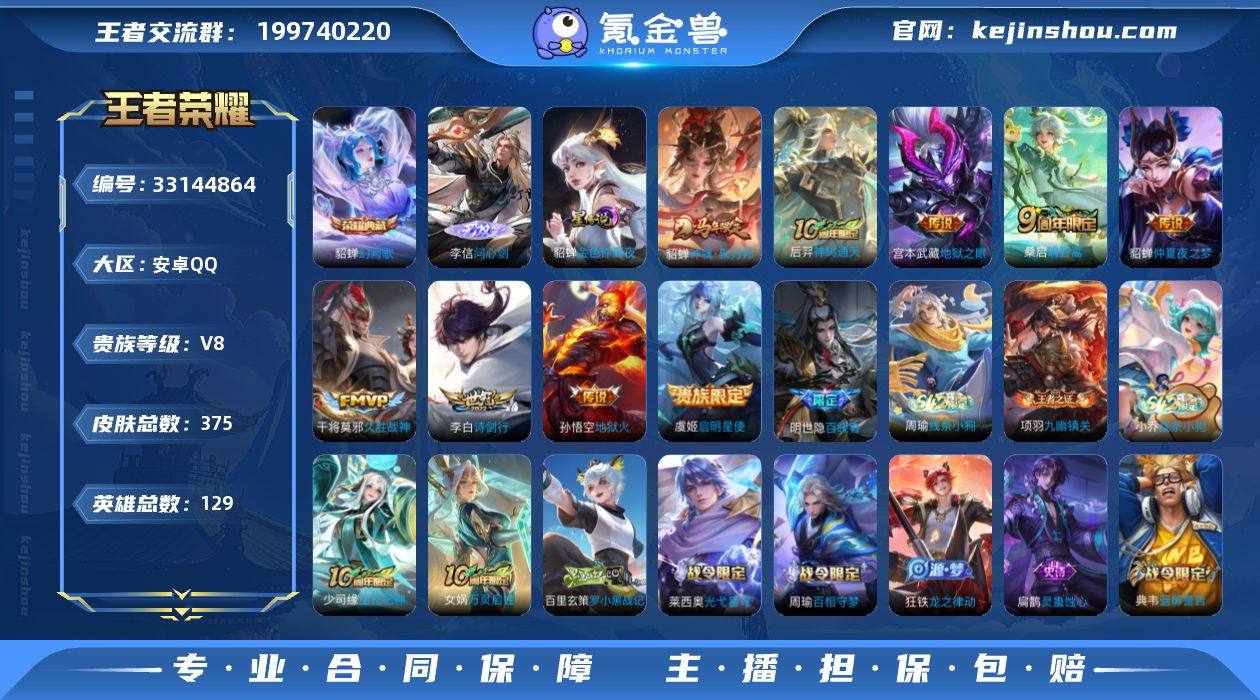 MCK633504 【问心剑!貂蝉典藏+马年!诗剑行!】 皮肤数量375 印记总数33 【V8】 【至尊星耀】 【可修改】 账号类型3 无双1 荣耀典藏1 星元皮肤1 传说10 史诗96 账号类型:打野号,中单号,上单号; 无双:李信_问心剑; 荣耀典藏:貂蝉_幻阙歌; 星元皮肤:貂蝉_金色仲夏夜; 传说:虞姬_启明星使,貂蝉_神骥·聚万邦,宫本武藏_地狱之眼,干将莫邪_久胜战神,后羿_神树通天,桑启_鸣野蒿,李白_诗剑行,孙尚香_异界灵契,貂蝉_仲夏夜之梦,孙悟空_地狱火; 史诗:明世隐_百晓客,娜可露露_晚萤,刘禅_天才门将,小乔_线条小狗,狂铁_龙之律动,周瑜_线条小狗,项羽_九幽镇关,杨戬_天秀启明,莱西奥_光弋星穹,扁鹊_灵蛊蚀心,百里玄策_罗小黑战记,少司缘-巫礼祀神,女娲-万灵启世,百里守约_特工魅影,铠_曙光守护者,周瑜_百相守梦,姬小满_妄想食味,大乔_猫狗日记,鲁班七号_电玩小子,孙膑_茶境仙,阿珂_化蝶舞,吕布_末日机甲,嬴政_暗夜贵公子,阿珂_节奏热浪,百里守约_百相守梦,牛魔_星界战将,蔡文姬_舞动绿茵,杨玉环_遇见飞天,伽罗_箭羽风息,露娜_紫霞仙子,嬴政_摇滚巨星,亚瑟_心灵战警,蒙恬_荣光圣徽,蒙犽_百解令,曹操_幽灵船长,阿古朵_江河有灵,廉...