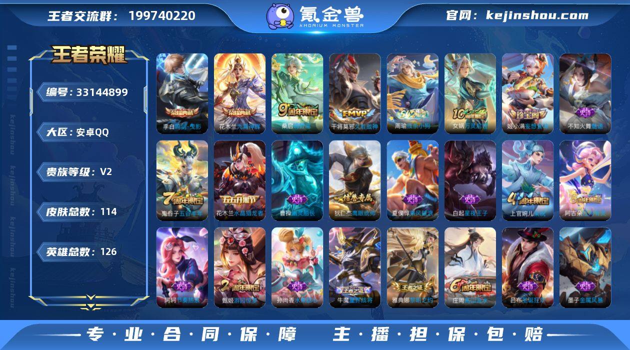 精品2典藏号 【荣耀典藏】:李白鸣剑曳影,花木兰九霄神辉 【传说皮肤】:桑启鸣野蒿,干将莫邪久胜战神 【限定皮肤】:姜子牙天穹之誓,狄仁杰阴阳师,庄周高山流水,夏侯惇朔风刀,甄姬游园惊梦,狄仁杰万华元夜,达摩沙漠行僧,老夫子醍醐杖,程咬金演武夺筹,兰陵王金庭之子,牛魔御旌,李元芳云中旅人,钟馗驱傩正仪,雅典娜黎明之约,鬼谷子原初探秘者,鬼谷子五谷丰年,苏烈千军破阵,弈星混沌棋,沈梦溪大漠名商,明世隐疑决卦,裴擒虎擒涛扼浪,狂铁御狮,米莱狄御霄,盾山御銮,上官婉儿梁祝,鲁班大师探海日志,桑启海盐诗旅,阿古朵江河有灵,张良古海寻踪,姬小满妄想食味,刘邦剑破天穹 【赛季限定】:狂铁御狮,米莱狄御霄,牛魔御旌,盾山御銮,夏侯惇朔风刀,弈星混沌棋,明世隐疑决卦,老夫子醍醐杖,鬼谷子原初探秘者,狄仁杰万华元夜,程咬金演武夺筹,钟馗驱傩正仪,苏烈千军破阵,达摩沙漠行僧,兰陵王金庭之子,沈梦溪大漠名商,李元芳云中旅人,桑启海盐诗旅,裴擒虎擒涛扼浪,鲁班大师探海日志,张良古海寻踪,刘邦剑破天穹,姜子牙天穹之誓,东皇太一噬灭天穹,太乙真人谧流熔炉,亚瑟荣光之誓,雅典娜黎明之约,牛魔星界战将 【战令限定】:周瑜线...