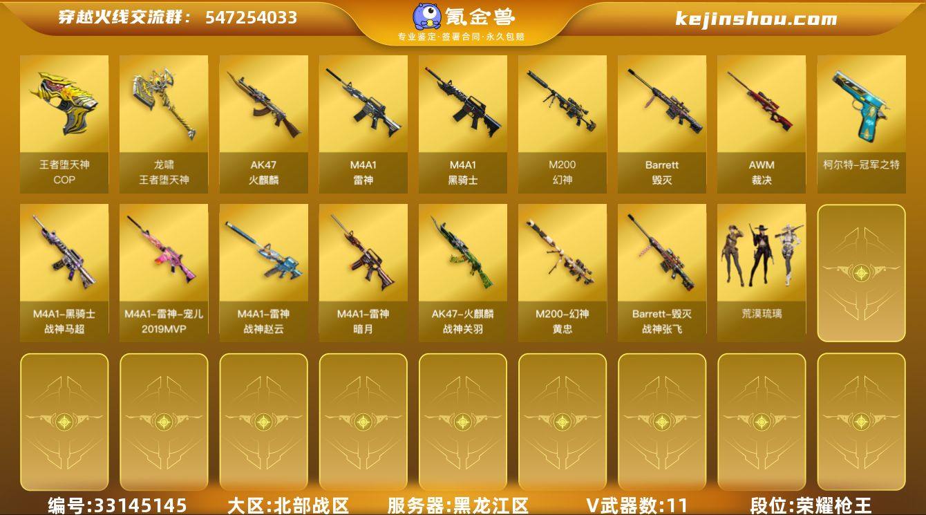 【ky6809】黑龙江区-18V-7王者武器数-0炫金武器数 【热门武器】:M200-幻神,柯尔特-冠军之特,M4A1-黑骑士 【王者炫金武器】:COP-王者堕天神*2,龙啸-王者堕天神,王者之魄高爆手雷,王者之魄闪光弹,王者之魄烟雾弹 【音效卡】:屠龙-电竞之星-竞星跃动音效卡,M4A1-黑骑士音效卡,Barrett-极光音效卡,HK417-朱雀-电竞之星-竞星跃动音效卡 【皮肤】:M200-幻神-黄忠皮肤,幻神-电竞之星 皮肤,雷神-暗月,M4A1-战神赵云,雷神-宠儿-2019MVP,雷神-紫凛 皮肤,火麒麟-战神关羽,毁灭-战神张飞,毁灭-英雄计划 皮肤,毁灭-斗烈龙驹 皮肤,黑骑士-战神马超 【角色】:荒漠琉璃,太空指挥官,不败狙神,云海玲珑,幻面灵狐,斗烈龙骑,北极狐-X,嘉年华灵狐,兰-新年限定,曼陀罗-X,潘多拉-X,斯沃特-X,蜀雪,兔囡囡,幽,团团 【人偶武器】:深渊终结者手雷 【暴走生化】:超级对讲机 【英雄级武器】:AK47-火麒麟,M4A1-雷神,M4A1-黑骑士,天罚-斗烈龙驹,Barrett-毁灭,AWM-裁决,M200-幻神,柯尔特-冠军之特,屠龙-电竞之星,屠龙-斗烈龙驹,闪光弹-夜魔,闪光弹-王者堕天神-觉醒版 【其他武器】:源·黑骑士,AWM-裁决-百城联赛天津 【道具】:战舰背包,绿色巨人,灵...