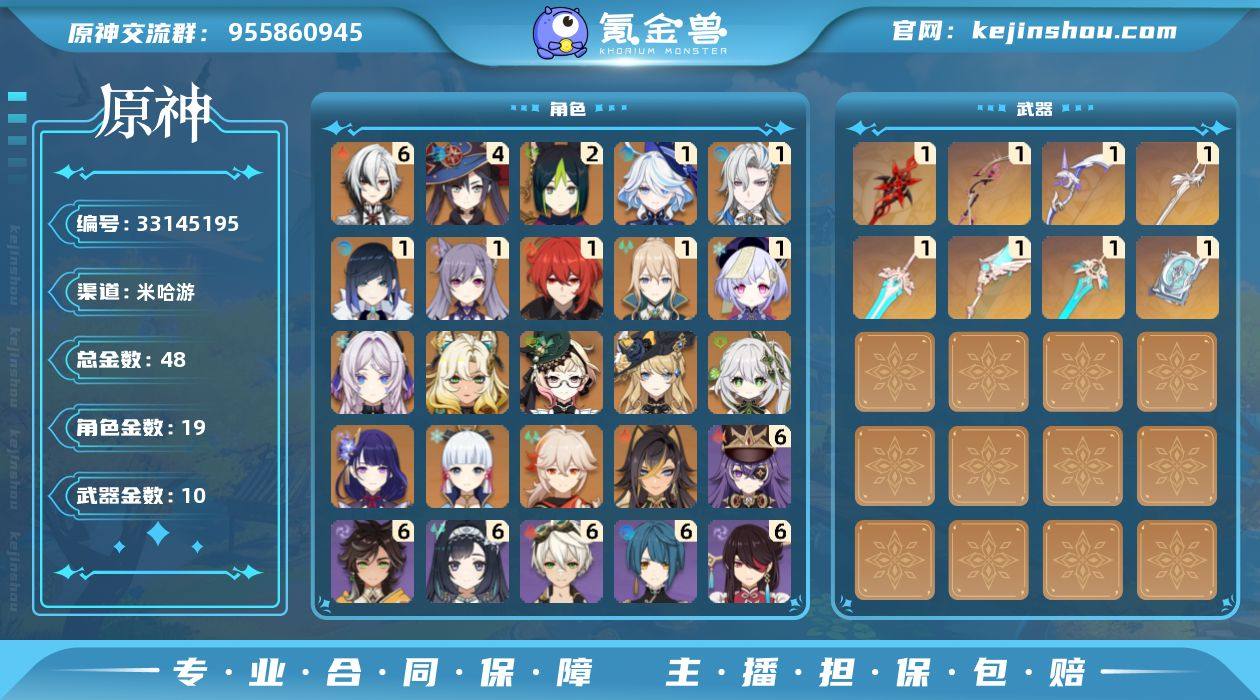 48黄! 冒险等级: 60 6命金色角色: 满命阿蕾奇诺 4命金色角色: 四命莫娜 2命金色角色: 二命提纳里 1命金色角色: 一命迪卢克,一命七七,一命刻晴,一命琴,一命夜兰,一命那维莱特,一命芙宁娜 0命金色角色: 枫原万叶,神里绫华,雷电将军,纳西妲,迪希雅,娜维娅,艾梅莉埃,希诺宁,茜特菈莉 拥有武器: 天空之翼,四风原典,阿莫斯之弓,天空之傲,风鹰剑,天空之刃,最初的大魔术,赤月之形 1精武器: 天空之翼,四风原典,阿莫斯之弓,天空之傲,风鹰剑,天空之刃,最初的大魔术,赤月之形