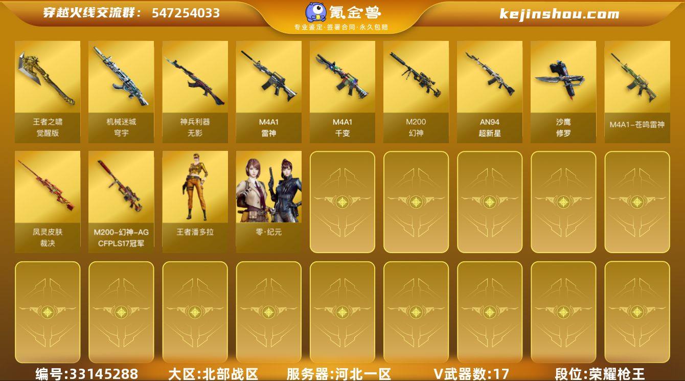 【ky6812】河北一区-20V-8王者武器数-0炫金武器数 【热门武器】:M200-幻神,沙鹰-修罗 【王者炫金武器】:王者凌虎 【音效卡】:屠龙-电竞之星-竞星跃动音效卡,HK417-朱雀-电竞之星-竞星跃动音效卡,Barrett-碧霄极光音效卡 【皮肤】:幻神-AG-CFPLS17冠军,AWM-裁决-凤灵皮肤,雷神-神秘按键 皮肤,轻型军用手斧-再燃火线 【角色】:零·纪元,王者潘多拉,乔伊教练,修道士,葵-阿尔法武装,幻面灵狐,风暴女,嘉年华灵狐,娟娟,兰-海滩派对,铁骑荣耀 【人偶武器】:AWM-灵狐-15周年嘉年华,生化手雷-机甲核心 【挑战大师】:神圣爆裂者-末日III 【英雄级武器】:M4A1-千变,M4A1-雷神,AN94-超新星,无影-神兵利器,HK417-朱雀-电竞之星,机械迷城-穹宇,M200-幻神,沙鹰-修罗,王者之啸-觉醒版,屠龙-电竞之星,高爆手雷-幻灵,高爆手雷-玄豹,高爆手雷-雷暴王者*3,闪光弹-幻灵,闪光弹-雷暴王者*3,烟雾弹-幻灵,烟雾弹-玄豹,M4A1-苍鸣雷神,AK47-竞魂无影 【其他武器】:源·火麒麟*2,源·雷神*5,魂·M4A1-雷神-化蛇,魂·雷神-神秘按键,魂·雷神-新春神龙,魂·雷神-15周年嘉年华,御·雷神-机甲刑天,源·黑骑士*2,御·黑骑士-冰魄*2,御·黑骑士·哪吒闹海,源·天启,...