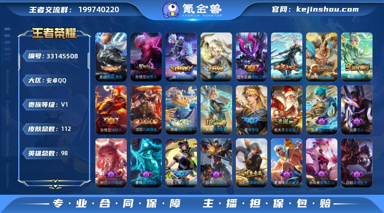 安卓Q-V0-最强王者段位-98英雄-112皮肤-1典藏皮肤-7传说-30史诗 【英雄全皮】:孙权全皮 【荣耀典藏】:李白鸣剑曳影 【传说皮肤】:桑启鸣野蒿,赵云乘龙铭钟鼎,澜逐花归海,吕布遇见神鼓,镜炽阳神光,宫本武藏地狱之眼,孙悟空地狱火 【限定皮肤】:暃埋骨钱,蒙犽顽岩魄,蔡文姬夏日便利店,虞姬夏日便利店,姜子牙天穹之誓,狄仁杰阴阳师,赵云皇家上将,孙尚香蔷薇恋人,吕布遇见神鼓,元歌无心,狄仁杰魔术师,项羽海滩派对,老夫子圣诞老人,李元芳云中旅人,裴擒虎擒涛扼浪,桑启海盐诗旅,蒙恬荣光圣徽,鬼谷子天穹祈灯,赵云乘龙铭钟鼎,百里玄策超元猎域,沈梦溪龙舞盛年,刘邦剑破天穹,镜青焰无极,项羽苍威无极 【年限皮肤】:赵云乘龙铭钟鼎 【赛季限定】:李元芳云中旅人,桑启海盐诗旅,裴擒虎擒涛扼浪,鬼谷子天穹祈灯,刘邦剑破天穹,姜子牙天穹之誓,东皇太一噬灭天穹,太乙真人谧流熔炉,钟馗虚灵犬护,亚瑟荣光之誓,蒙恬荣光圣徽,牛魔星界战将,项羽九幽镇关 【战令限定】:镜青焰无极,项羽苍威无极,蔡文姬夏日便利店,虞姬夏日便利店,亚连破空之剑,廉颇撼地雄心,孙悟空神迹守卫,周瑜线条小狗 【史诗皮肤】:周瑜线条小狗,项羽九幽镇关,女...