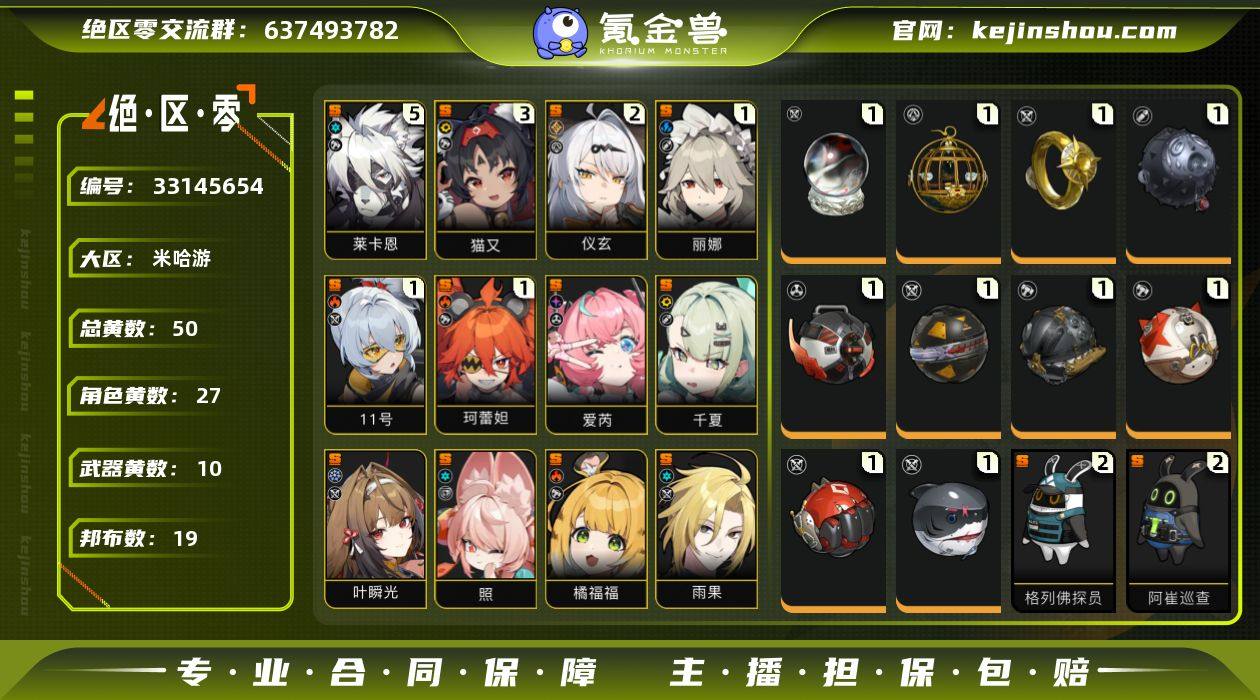 邮箱: 未绑定 男/女主: 女主 总黄数: 50 拥有S级代理人: 艾莲,猫又,「11号」,珂蕾妲,莱卡恩,格莉丝,丽娜,朱鸢,简,凯撒,柏妮思·怀特,月城柳,莱特,星见雅,浅羽悠真,耀嘉音,伊芙琳,零号·安比,扳机,薇薇安,雨果,仪玄,橘福福,叶瞬光,照,千夏,爱芮 5命S级代理人: 5命莱卡恩 3命S级代理人: 3命猫又 2命S级代理人: 2命仪玄 1命S级代理人: 1命珂蕾妲,1命「11号」,1命丽娜 0命S级代理人: 0命艾莲,0命格莉丝,0命朱鸢,0命简,0命凯撒,0命柏妮思·怀特,0命月城柳,0命莱特,0命星见雅,0命浅羽悠真,0命耀嘉音,0命伊芙琳,0命零号·安比,0命扳机,0命薇薇安,0命雨果,0命橘福福,0命叶瞬光,0命照,0命千夏,0命爱芮 拥有S级音擎: 深海访客,钢铁肉垫,燃狱齿轮,拘缚者,硫磺石,嵌合编译器,啜泣摇篮,千面日陨,青溟笼舍,云霓孤光 精1音擎: 精1深海访客,精1钢铁肉垫,精1燃狱齿轮,精1拘缚者,精1硫磺石,精1嵌合编译器,精1啜泣摇篮,精1千面日陨,精1青溟笼舍,精1云霓孤光