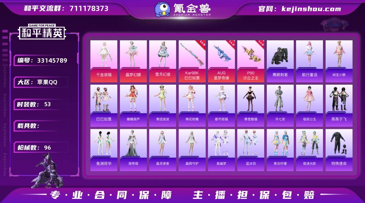 苹果 手Q-3粉装-6特效枪-0载具-3粉色飞行器-26856热力值-1王牌印记-53套装-96枪皮 【粉色套装】:角色-千金淑猫,角色-晶梦幻蝶,粉装-雪月幻音 【粉色枪皮等级】:AUG-星梦奇缘(三级),P90-沙丘之主(三级),Kar98K-巳巳如意(五级),Mk14-福马献瑞(五级),AA12-G-萌骑幻想(二级),燃烧瓶-天降桃花(六级) 【粉色枪皮】:AUG-星梦奇缘,P90-沙丘之主,Kar98K-巳巳如意,Mk14-福马献瑞,AA12-G-萌骑幻想,燃烧瓶-天降桃花 【粉色飞行器】:沙丘之主天马,镜域双华-灵镜之阶,曦光华影飞行器 【粉色降落伞】:精灵之光降落伞,千金淑猫降落伞,临安公主降落伞,晶梦幻蝶降落伞 【稀有套装】:套装-航行童话,套装-绒宝小鹅,套装-巳巳如意,套装-马上有钱,套装-迅捷龙虾,套装-糖糖葫芦,套装-青团波波,套装-棉花软糖,角色-都市丽猫,角色-摩登魅猫,角色-许七安,角色-临安公主,套装-燕燕于飞,套装-鱼渊荷华,角色-海琴烟,套装-晶灵使者,套装-晶辉守护,套装-紫幽梦,套装-蓝冰羽,套装-果冻柠檬,套装-极速光影,套装-雨过天青,套装-红釉青花 【稀有枪皮】:M16A4-千金淑猫,SCAR-L-夜灯,SCAR-L-炫彩节奏,M416-红色方程式,GROZA-影袭,GROZA-晶梦幻蝶,AUG-甜蜜菠萝...