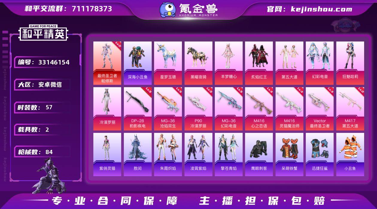 特价号安卓 微信-1神装-6粉装-8特效枪-2载具-6粉色飞行器-33339热力值-3王牌印记-57套装-84枪皮 【红色神装等级】:最终圣卫者-帕修斯(二级) 【红色角色神装】:最终圣卫者-帕修斯 【热门品类】:套装-深海小丑鱼,套装-小丑鱼 【粉色载具】:星梦玉骢,黑曜夜骑 【粉色套装】:粉装-炙焰红王,粉装-第五大道,粉装-幻彩电音,角色-狂魅哈莉,角色-冷漠罗丽,角色-羊梦糖心 【粉色枪皮等级】:M416-心之恋语(三级),M416-灵猫魔法师(三级),Vector-最终圣卫者(三级),P90-冷漠罗丽(五级),M417-第五大道(二级),DP-28-豹影疾电(五级),MG-36-幻彩电音(五级),MG-36-沧焰双生(五级) 【粉色枪皮】:M416-心之恋语,M416-灵猫魔法师,Vector-最终圣卫者,P90-冷漠罗丽,M417-第五大道,DP-28-豹影疾电,MG-36-幻彩电音,MG-36-沧焰双生 【粉色飞行器】:镜光幻境飞行翼,终晖之翼飞行器,灵猫魔法师飞行器,飞天猪飞行器,灵珠游龙飞行器 【粉色降落伞】:童趣迷兔降落伞,第五大道降落伞,星穹咏叹调降落伞,幻彩电音降落伞,双重狂想降落伞,最终圣卫者降落伞,冷漠罗丽降落伞,灵猫魔法师降落伞,魔童闹海 哪吒降落伞 【稀有套装】:套装-小鸟芋圆,套装-兰香蝶语,角色-都市...