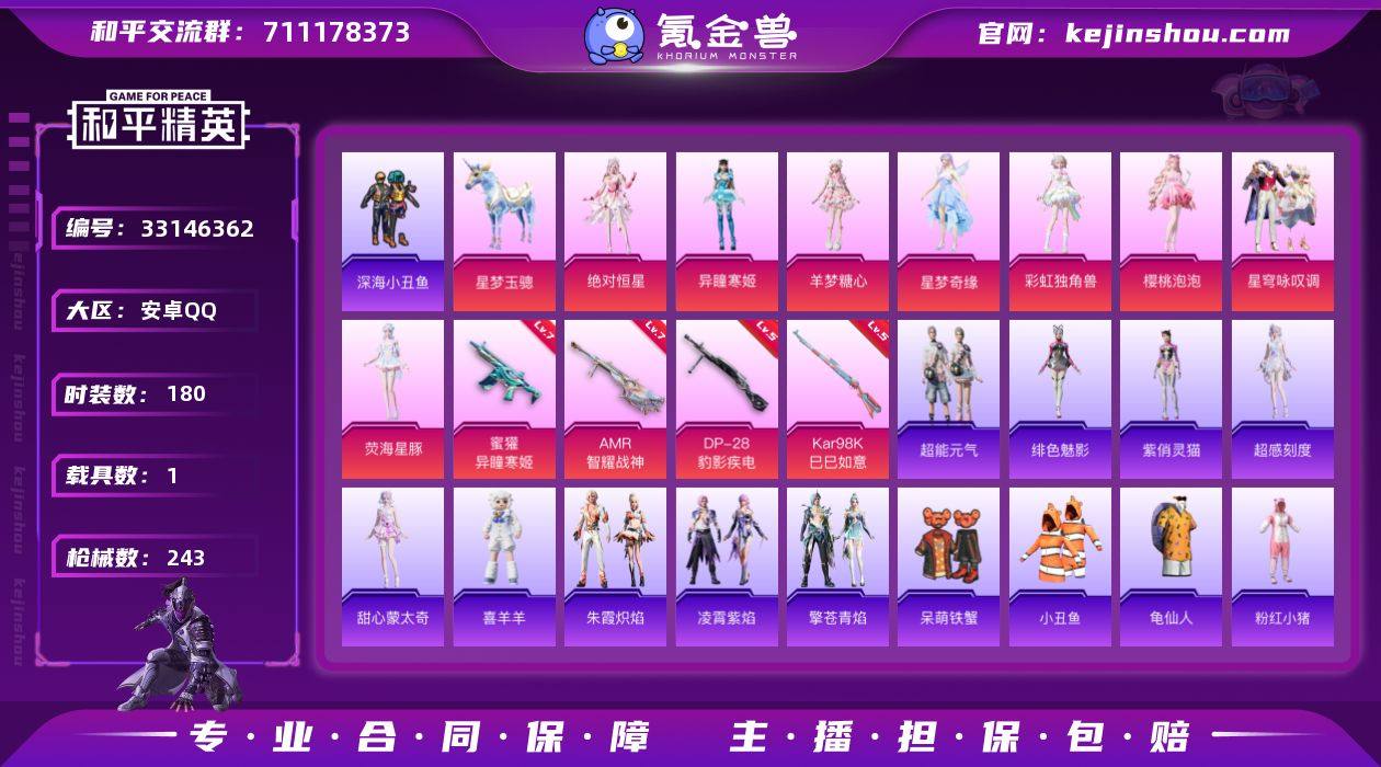 安卓 手Q-11粉装-6特效枪-1载具-6粉色飞行器-69406热力值-7王牌印记-180套装-243枪皮 【热门品类】:套装-深海小丑鱼,套装-小丑鱼,套装-龟仙人,套装-粉红小猪 【粉色套装】:角色-绝对恒星,角色-星梦奇缘,角色-彩虹独角兽,角色-樱桃泡泡,粉装-星穹咏叹调,角色-荧海星豚,角色-羊梦糖心,角色-异瞳寒姬,角色-罪夜之冕,角色-烬夜之誓,角色-鸢尾珑雾 【粉色枪皮等级】:蜜獾-异瞳寒姬(七级),Kar98K-巳巳如意(五级),Mk14-福马献瑞(五级),AMR-智耀战神(七级),AA12-G-萌骑幻想(五级),DP-28-豹影疾电(五级) 【粉色载具】:星梦玉骢 【粉色枪皮】:蜜獾-异瞳寒姬,Kar98K-巳巳如意,Mk14-福马献瑞,AMR-智耀战神,AA12-G-萌骑幻想,DP-28-豹影疾电 【粉色飞行器】:绝对恒星飞行器,炫彩糖果飞行器,幻星舰长飞行器,辉光之愿飞行器,踏卷乘风飞行器,冰狼掠影飞行器 【粉色降落伞】:绝对恒星降落伞,沙丘之主降落伞,精灵梦叶罗丽降落伞,星梦奇缘降落伞,幽焰骑士降落伞,千金淑猫降落伞,月下星之子降落伞,圣辉之星降落伞,智耀战神降落伞,星穹咏叹调降落伞,幻星舰长降落伞,幻彩电音降落伞,冷漠罗丽降落伞,无垠阁降落伞,异瞳寒姬降落伞,炫彩糖果降落伞,...