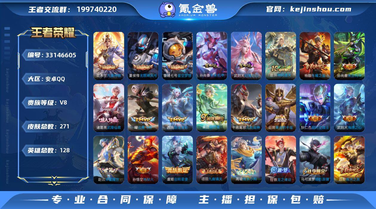 【编号52349,可秒换绑】【店长推荐!极品典藏号!武则天,,花木兰九霄神辉,,夏侯惇无限飓风号,,鲁班七号星空梦想,,诸葛亮武陵仙君,,杨戬永曜之星!!】,安卓Q-V8-尊贵铂金I段位-128英雄-271皮肤-3典藏皮肤-1典藏英雄-14传说-65史诗 【英雄全皮】:鬼谷子全皮,狂铁全皮 【荣耀典藏】:武则天英雄,夏侯惇无限飓风号,鲁班七号星空梦想,花木兰九霄神辉 【传说皮肤】:后羿神树通天,桑启鸣野蒿,赵云淬星耀世,西施游龙清影,虞姬启明星使,曜云鹰飞将,干将莫邪久胜战神,后羿黄金射手座,杨戬永曜之星,诸葛亮武陵仙君,孙尚香末日机甲,孙悟空地狱火,武则天海洋之心,狄仁杰超时空战士 【限定皮肤】:姜子牙天穹之誓,狄仁杰阴阳师,赵云皇家上将,墨子神迹守卫,妲己热情桑巴,高渐离死亡摇滚,高渐离玩趣恶龙,扁鹊奇幻香踪,芈月重明,夏侯惇朔风刀,甄姬幽恒,曹操烛龙,典韦穷奇,马可波罗逐梦之星,马可波罗暗影游猎,狄仁杰魔术师,狄仁杰万华元夜,达摩沙漠行僧,项羽海滩派对,老夫子醍醐杖,老夫子航海奇遇记,貂蝉逐梦之音,程咬金演武夺筹,王昭君午后时光,兰陵王金庭之子,花木兰青春决赛季,牛魔御旌,后羿辉光之辰,李元芳银河之约,李元芳云中...