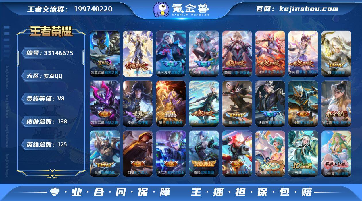 V8 1无双 21传说 1星元 138皮肤 125英雄 【1无双】【21传说】李信-山海·炽霜斩,狄仁杰-神器·狴犴令,马可波罗-深海之息,狄仁杰-超时空战士,宫本武藏-地狱之眼,镜-炽阳神光,李信-一念神魔,刘备-时之恋人,孙策-末日机甲,虞姬-启明星使,吕布-怒海麟威,诸葛亮-鹤羽星尊,孙尚香-乘龙·问璇玑,孙策-乘龙·淬吴钩,赵云-乘龙·铭钟鼎,亚连-落雪白狼,澜-电玩·雷克斯,墨子-黄金天蝎座,曜-云鹰飞将,司空震-愿照·山河定【1星元】宫本武藏-幽冥之眼【36史诗】上官婉儿-神器·万象笔,赵云-未来纪元,澜-赏金猎手,夏洛特-永昼,白起-星夜王子,曹操-幽灵船长,妲己-魅力维加斯,狄仁杰-魔术师,狄仁杰-鹰眼统帅,貂蝉-圣诞恋歌,宫本武藏-鬼剑武藏,花木兰-水晶猎龙者,兰陵王-暗隐猎兽者,李白-千年之狐,吕布-末日机甲,墨子-金属风暴,上官婉儿-梁祝,孙策-猫狗日记,孙尚香-水果甜心,孙悟空-孙行者,王昭君-偶像歌手,雅典娜-冰冠公主,张飞-乱世虎臣,赵云-皇家上将,扁鹊-奇幻香踪,瑶-山海·碧波行,鲁班七号-蔬乡物语,马可波罗-山海·玄木吟,蒙犽-百解令,蒙恬-荣光圣徽,伽罗-琥珀纪元,狂铁-龙之律动,黄忠-百相守梦,公孙离-涂山容容,小乔-线条小狗,少司缘-巫礼祀神