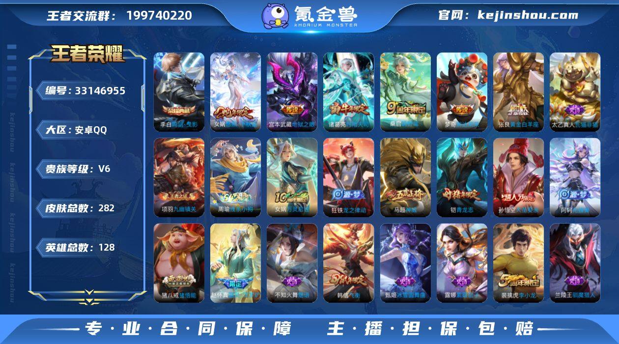 小国高渐离,安卓Q-V6-最强王者段位-128英雄-282皮肤-1典藏皮肤-6传说-69史诗 【英雄全皮】:孙权全皮,影全皮 【荣耀典藏】:李白鸣剑曳影 【传说皮肤】:女娲愿照千秋盛,桑启鸣野蒿,诸葛亮时雨天司,张良黄金白羊座,梦奇胖达荣荣,宫本武藏地狱之眼 【限定皮肤】:白起狰,姜子牙天穹之誓,杨戬破阵退雄兵,狄仁杰阴阳师,赵云皇家上将,墨子神迹守卫,嬴政白昼王子,高渐离死亡摇滚,高渐离玩趣恶龙,芈月重明,周瑜赤莲之焰,夏侯惇朔风刀,曹操烛龙,典韦穷奇,狄仁杰魔术师,狄仁杰万华元夜,项羽海滩派对,老夫子醍醐杖,老夫子航海奇遇记,程咬金演武夺筹,韩信飞衡,兰陵王驯魔猎人,孙悟空大圣娶亲,牛魔御旌,后羿如梦令,李元芳云中旅人,钟馗驱傩正仪,杨玉环遇见飞天,女娲朔望之晖,干将莫邪胡桃夹子,雅典娜黎明之约,蔡文姬繁星吟游,太乙真人华丽摇滚,鬼谷子原初探秘者,鬼谷子五谷丰年,诸葛亮时雨天司,铠青龙志,苏烈千军破阵,百里玄策原初追逐者,弈星混沌棋,梦奇顽趣,明世隐疑决卦,裴擒虎李小龙,裴擒虎擒涛扼浪,狂铁御狮,米莱狄御霄,云中君纤云弄巧,伽罗天狼溯光者,盾山御銮,猪八戒猪悟能,上官婉儿梁祝,鲁班大师探海日志,桑启海盐诗...
