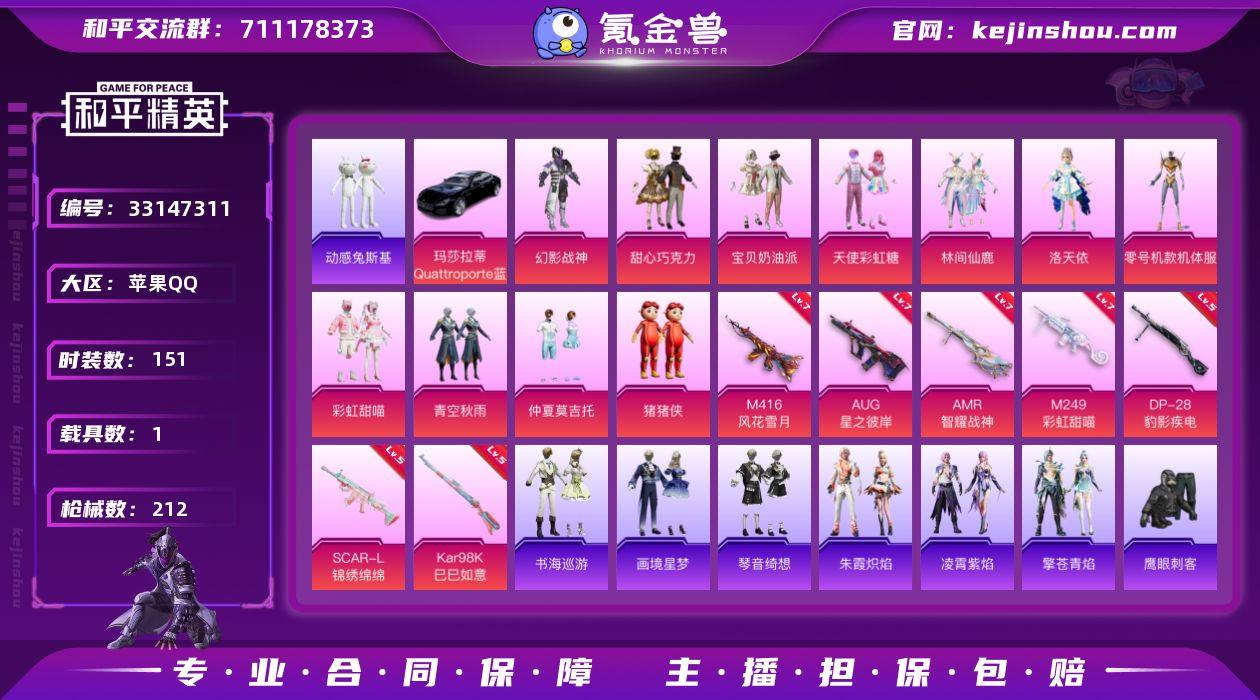 苹果【男神号 套装-暗影哥特,甜心三姐妹,角色-洛天依,角色-零号机款机体服,M416-风花雪月(七级),AUG-星之彼岸(七级),玛莎拉蒂Quattroporte(夜幕蓝),百万伏特背包(3级)】 手Q-12粉装-9特效枪-1载具-2粉色飞行器-68872热力值-13王牌印记-151套装-212枪皮 【热门品类】:套装-小丑鱼,套装-动感兔斯基人偶服,套装-龟仙人,套装-暗影哥特 【粉色套装】:粉装-幻影战神,粉装-甜心巧克力,粉装-宝贝奶油派,粉装-天使彩虹糖,粉装-林间仙鹿,角色-洛天依,角色-零号机款机体服,粉装-彩虹甜喵,粉装-青空秋雨,粉装-仲夏莫吉托,玩偶服-猪猪侠,角色-辉云木星 【粉色枪皮等级】:SCAR-L-锦绣绵绵(五级),M416-风花雪月(七级),AUG-星之彼岸(七级),UMP45-萌骑冒险(四级),Kar98K-巳巳如意(五级),Mk14-福马献瑞(五级),AMR-智耀战神(七级),M249-彩虹甜喵(七级),DP-28-豹影疾电(五级) 【粉色载具】:玛莎拉蒂Quattroporte(夜幕蓝) 【粉色枪皮】:SCAR-L-锦绣绵绵,M416-风花雪月,AUG-星之彼岸,UMP45-萌骑冒险,Kar98K-巳巳如意,Mk14-福马献瑞,AMR-智耀战神,M249-彩虹甜喵,DP-28-豹影疾电 【粉色飞行器】:炫彩糖果飞行器,星之彼岸飞行器 【粉色降落伞】:幻影...
