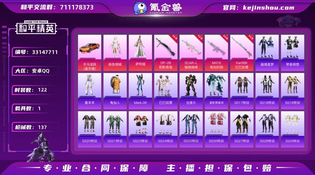 安卓 【小号 SCAR-L-锦绣绵绵/M416-电玩时刻/蓝螳螂/套装-龟仙人】手Q-3粉装-4特效枪-1载具-2粉色飞行器-41563热力值-5王牌印记-122套装-137枪皮 【热门品类】:套装-龟仙人,角色-Mark.06 【粉色套装】:角色-绝色倾城,角色-萨利娅,角色-镜中幻 【粉色枪皮等级】:SCAR-L-锦绣绵绵(五级),M416-电玩时刻(五级),Kar98K-巳巳如意(五级),DP-28-豹影疾电(五级) 【粉色载具】:天马凌跃(星芒橙) 【粉色枪皮】:SCAR-L-锦绣绵绵,M416-电玩时刻,Kar98K-巳巳如意,DP-28-豹影疾电 【粉色飞行器】:炫彩糖果飞行器,绝色倾城飞行器 【粉色降落伞】:垂柳戏鸭降落伞,闲梦青缨降落伞,炫光之旅降落伞,蜜语绒猫降落伞,绝色倾城降落伞,精灵梦叶罗丽降落伞,创世·救赎降落伞,初号机 觉醒Ver.降落伞,雪月幻音降落伞,炫彩糖果降落伞,虹云熊熊降落伞 【稀有套装】:套装-龟仙人,套装-巳巳如意,套装-炫彩糖果,角色-拉斐尔,套装-星影赞美诗,玩偶服-喜羊羊,套装-画境星梦,套装-琴音绮想,套装-雨过天青,套装-红釉青花,角色-暖阳柴柴 【稀有枪皮】:AUG-冰晶雪宝,AKM-破晓战魂,M16A4-幻世战舞者,SCAR-L-炫彩节奏,SCAR-L-玉兔迎春,SCAR-L-红色方程式,M416-糯团青竹...
