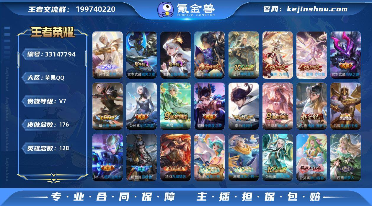 苹果Q-V7-最强王者段位-128英雄-176皮肤-1无双-14传说-53史诗 个性按键亲密道具多多 【英雄全皮】:敖隐全皮,影全皮 【无双皮肤】:孙悟空无相 【传说皮肤】:马超神骥逐星野,后羿神树通天,澜愿照九州拓,虞姬愿照岁时盈,王昭君映山客,桑启鸣野蒿,公孙离记忆之芯,李白诗剑行,狄仁杰神器狴犴令,曜云鹰飞将,后羿黄金射手座,貂蝉仲夏夜之梦,宫本武藏地狱之眼,狄仁杰超时空战士 【限定皮肤】:姜子牙天穹之誓,狄仁杰阴阳师,赵云皇家上将,赵云龙胆,墨子降魔,钟无艳超时空战士,元歌无心,甄姬落雪兰心,狄仁杰魔术师,狄仁杰神器狴犴令,达摩沙漠行僧,项羽海滩派对,老夫子航海奇遇记,李元芳云中旅人,干将莫邪胡桃夹子,鬼谷子五谷丰年,苏烈千军破阵,梦奇顽趣,沈梦溪大漠名商,裴擒虎擒涛扼浪,桑启海盐诗旅,高渐离燃音魔法,妲己灵卜魔法,鬼谷子天穹祈灯,伽罗琥珀纪元,沈梦溪龙舞盛年 【年限皮肤】:澜愿照九州拓,虞姬愿照岁时盈 【赛季限定】:苏烈千军破阵,达摩沙漠行僧,沈梦溪大漠名商,李元芳云中旅人,桑启海盐诗旅,裴擒虎擒涛扼浪,鬼谷子天穹祈灯,姜子牙天穹之誓,东皇太一噬灭天穹,太乙真人谧流熔炉,钟馗虚灵犬护,甄姬逆浪荇歌,亚瑟...