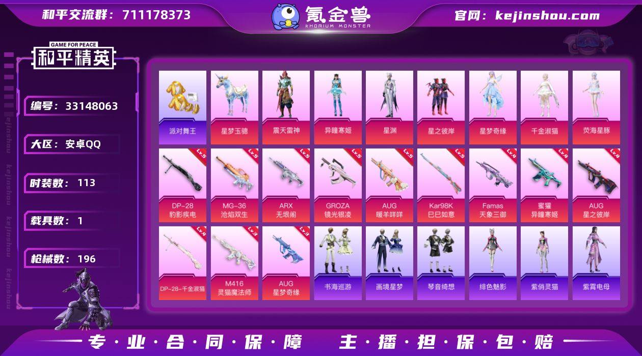 安卓 手Q-7粉装-15特效枪-1载具-4粉色飞行器-57316热力值-3王牌印记-113套装-196枪皮 【热门品类】:套装-派对舞王 【粉色套装】:粉装-星之彼岸,角色-星梦奇缘,角色-千金淑猫,角色-荧海星豚,角色-星渊,角色-异瞳寒姬,角色-震天雷神 【粉色枪皮等级】:M416-灵猫魔法师(三级),GROZA-镜光银凌(五级),AUG-星之彼岸(四级),AUG-星梦奇缘(三级),AUG-暖羊咩咩(五级),蜜獾-异瞳寒姬(四级),Famas-天象三御(四级),ARX-无垠阁(五级),AKS-74U-森灵之息(五级),Kar98K-巳巳如意(五级),Mk14-福马献瑞(五级),AA12-G-萌骑幻想(四级),DP-28-千金淑猫(四级),DP-28-豹影疾电(五级),MG-36-沧焰双生(五级) 【粉色载具】:星梦玉骢 【粉色枪皮】:M416-灵猫魔法师,GROZA-镜光银凌,AUG-星之彼岸,AUG-星梦奇缘,AUG-暖羊咩咩,蜜獾-异瞳寒姬,Famas-天象三御,ARX-无垠阁,AKS-74U-森灵之息,Kar98K-巳巳如意,Mk14-福马献瑞,AA12-G-萌骑幻想,DP-28-千金淑猫,DP-28-豹影疾电,MG-36-沧焰双生 【粉色飞行器】:炫彩糖果飞行器,灵猫魔法师飞行器,天象三御飞行器,极意拳锋飞行器 【粉色降落伞】:星之彼岸降落伞,猪猪侠降落伞,星梦奇缘降落伞,千金淑猫降落伞,星穹咏叹调...