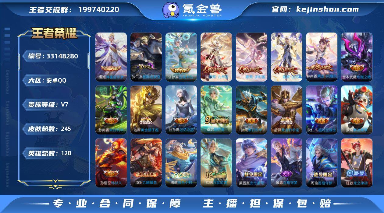安卓Q-V7-最强王者段位-128英雄-245皮肤-1典藏皮肤-15传说-66史诗 【英雄全皮】:孙权全皮,敖隐全皮,戈娅全皮 【荣耀典藏】:虞姬神鉴启示录 【传说皮肤】:公孙离云诺千山,司空震愿照山河定,澜愿照九州拓,虞姬愿照岁时盈,桑启鸣野蒿,孙尚香乘龙问璇玑,公孙离记忆之芯,孙策末日机甲,达摩黄金狮子座,梦奇胖达荣荣,后羿黄金射手座,孙尚香末日机甲,宫本武藏地狱之眼,孙悟空地狱火,狄仁杰超时空战士 【限定皮肤】:蒙犽顽岩魄,蔡文姬夏日便利店,大乔绒语心约,虞姬夏日便利店,姜子牙天穹之誓,狄仁杰阴阳师,赵云皇家上将,赵云引擎之心,嬴政白昼王子,高渐离玩趣恶龙,吕布猎兽之王,元歌云间偶戏,典韦蓝屏警告,马可波罗暗影游猎,马可波罗山海玄木吟,狄仁杰魔术师,项羽海滩派对,孙悟空大圣娶亲,牛魔御旌,李元芳银河之约,李元芳云中旅人,钟馗神迹守卫,钟馗驱傩正仪,杨戬潮玩骑兵,女娲朔望之晖,干将莫邪冰霜恋舞曲,鬼谷子五谷丰年,铠青龙志,梦奇顽趣,公孙离蜜橘之夏,裴擒虎擒涛扼浪,狂铁御狮,米莱狄御霄,盾山御銮,上官婉儿梁祝,嫦娥暖冬兔眠,鲁班大师探海日志,桑启海盐诗旅,戈娅驭风魔法,艾琳女武神,艾琳流音漫舞,阿古朵江河有...