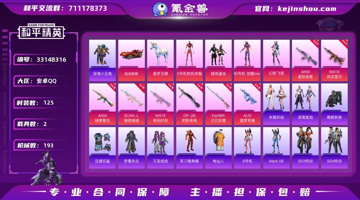 安卓 手Q-4粉装-10特效枪-2载具-3粉色飞行器-62105热力值-9王牌印记-125套装-193枪皮 【热门品类】:套装-深海小丑鱼,角色-军刀雅典娜,套装-龟仙人,角色-8号机,角色-Mark.06 【粉色套装】:角色-2号机款机体服,粉装-暗夜鎏金,角色-初号机 觉醒Ver.,粉装-幻影飞狐 【粉色枪皮等级】:AKM-星际浪客(七级),AKM-绿萝繁花(五级),SCAR-L-锦绣绵绵(五级),M416-风花雪月(七级),M416-电玩时刻(五级),AUG-星梦奇缘(三级),UMP45-萌骑冒险(五级),Kar98K-巳巳如意(四级),Mk14-福马献瑞(五级),DP-28-豹影疾电(四级) 【粉色载具】:焰龙咆哮,星梦玉骢 【粉色枪皮】:AKM-星际浪客,AKM-绿萝繁花,SCAR-L-锦绣绵绵,M416-风花雪月,M416-电玩时刻,AUG-星梦奇缘,UMP45-萌骑冒险,Kar98K-巳巳如意,Mk14-福马献瑞,DP-28-豹影疾电 【粉色飞行器】:星际浪客飞行器,纯梦嫁纱飞行翼,星梦奇缘飞行器 【粉色降落伞】:百万伏特降落伞,春暖花开降落伞,星之彼岸降落伞,星际浪客降落伞,纯梦嫁纱降落伞,江南烟雨降落伞,精灵梦叶罗丽降落伞,星梦奇缘降落伞,炫彩糖果降落伞,虎痴许褚降落伞 【稀有套装】:套装-龟仙人,套装-马上有钱,套装-迅捷龙虾,套装-朱霞炽焰,套装-...