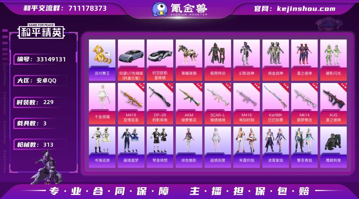 安卓 手Q-1神装-6粉装-12特效枪-3载具-9粉色飞行器-103704热力值-21王牌印记-229套装-313枪皮 【红色神装等级】:暮色玫影-艾丽娅(四级) 【红色角色神装】:暮色玫影-艾丽娅 【热门品类】:套装-派对舞王,套装-金羽特工,套装-忍者信条,套装-龟仙人,套装-暗影哥特,套装-粉红小猪,角色-Mark.06 【粉色套装】:粉装-极限特训,粉装-幻影战神,粉装-绚金战神,粉装-星之彼岸,粉装-碧影闪光,角色-千金淑猫 【粉色枪皮等级】:AKM-绿萝繁花(五级),AKM-暮色玫影(三级),SCAR-L-锦绣绵绵(五级),M416-至情至圣(九级),M416-电玩时刻(五级),AUG-星之彼岸(四级),AKS-74U-森灵之息(五级),Kar98K-巳巳如意(五级),Mk14-甜梦熊击(五级),Mk14-福马献瑞(二级),AA12-G-萌骑幻想(三级),DP-28-豹影疾电(五级) 【粉色载具】:仰望U7(阿盖尔紫),时空跃影(星辉银),黑曜夜骑 【粉色枪皮】:AKM-绿萝繁花,AKM-暮色玫影,SCAR-L-锦绣绵绵,M416-至情至圣,M416-电玩时刻,AUG-星之彼岸,AKS-74U-森灵之息,Kar98K-巳巳如意,Mk14-甜梦熊击,Mk14-福马献瑞,AA12-G-萌骑幻想,DP-28-豹影疾电 【粉色飞行器】:炫彩糖果飞行器,星之彼岸飞行器,凤舞九天飞行器,万象金身飞行器,...