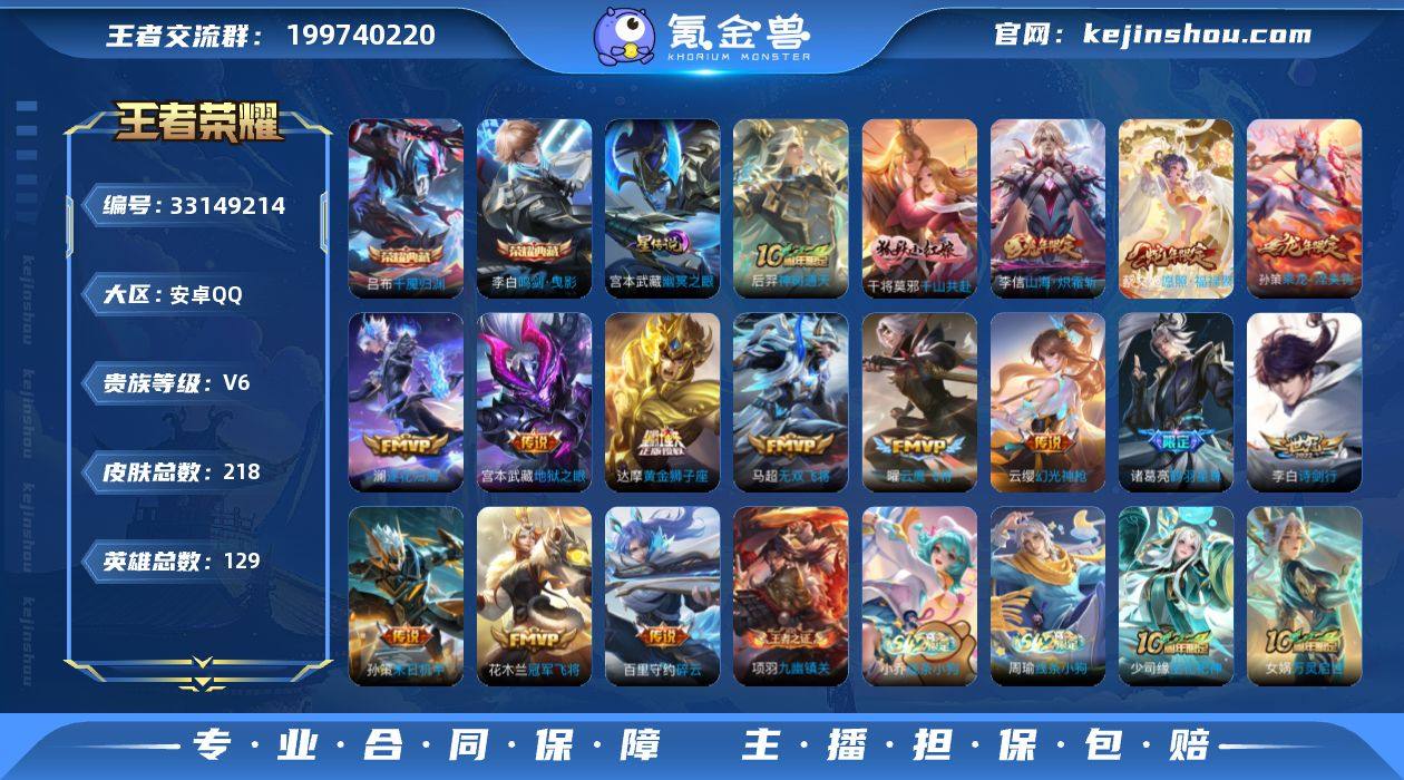 安卓Q-V6-至尊星耀IV段位-129英雄-218皮肤-2典藏皮肤-16传说-75史诗 【英雄全皮】:孙权全皮,敖隐全皮 【荣耀典藏】:李白鸣剑曳影,吕布千魇归渊 【传说皮肤】:后羿神树通天,干将莫邪千山共赴,蔡文姬愿照福禄聚,云缨幻光神枪,孙策乘龙淬吴钩,澜逐花归海,诸葛亮鹤羽星尊,李信山海炽霜斩,李白诗剑行,百里守约碎云,马超无双飞将,孙策末日机甲,曜云鹰飞将,达摩黄金狮子座,花木兰冠军飞将,宫本武藏地狱之眼 【限定皮肤】:姜子牙天穹之誓,狄仁杰阴阳师,赵云皇家上将,赵云引擎之心,嬴政白昼王子,高渐离玩趣恶龙,钟无艳王者之锤,马可波罗暗影游猎,马可波罗山海玄木吟,狄仁杰魔术师,达摩沙漠行僧,项羽海滩派对,老夫子醍醐杖,程咬金演武夺筹,韩信飞衡,兰陵王金庭之子,孙悟空至尊宝,李元芳云中旅人,雅典娜黎明之约,鬼谷子原初探秘者,鬼谷子五谷丰年,诸葛亮鹤羽星尊,百里玄策原初追逐者,梦奇顽趣,沈梦溪大漠名商,明世隐疑决卦,裴擒虎李小龙,裴擒虎擒涛扼浪,云中君时之祈愿,李信山海炽霜斩,猪八戒西部大镖客,上官婉儿梁祝,嫦娥暖冬兔眠,西施玲珑珍味,鲁班大师探海日志,桑启海盐诗旅,暃星界游侠,戈娅驭风魔法,阿古朵江河有灵,张...