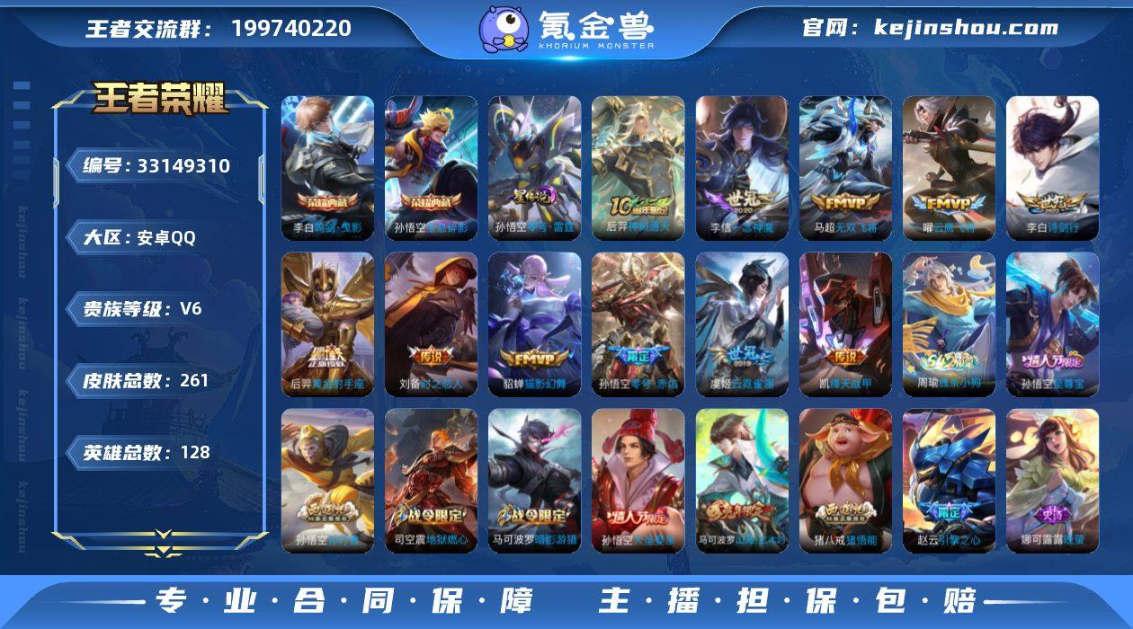 安卓Q-V6-永恒钻石V段位-128英雄-261皮肤-2典藏皮肤-11传说-75史诗 【英雄全皮】:猪八戒全皮 【荣耀典藏】:孙悟空全息碎影,李白鸣剑曳影 【传说皮肤】:后羿神树通天,李白诗剑行,马超无双飞将,铠绛天战甲,孙悟空零号赤焰,曜云鹰飞将,李信一念神魔,刘备时之恋人,貂蝉猫影幻舞,虞姬云霓雀翎,后羿黄金射手座 【限定皮肤】:大乔绒语心约,姜子牙天穹之誓,狄仁杰阴阳师,赵云皇家上将,赵云引擎之心,庄周高山流水,高渐离死亡摇滚,高渐离玩趣恶龙,钟无艳超时空战士,扁鹊奇幻香踪,芈月重明,元歌无心,夏侯惇朔风刀,甄姬落雪兰心,曹操烛龙,典韦穷奇,马可波罗暗影游猎,马可波罗山海玄木吟,狄仁杰魔术师,狄仁杰万华元夜,达摩沙漠行僧,项羽海滩派对,老夫子醍醐杖,老夫子航海奇遇记,关羽百相守梦,程咬金演武夺筹,韩信飞衡,兰陵王金庭之子,孙悟空至尊宝,孙悟空大圣娶亲,孙悟空零号赤焰,孙悟空孙行者,牛魔御旌,后羿如梦令,后羿圣弓游侠,李元芳云中旅人,钟馗驱傩正仪,杨戬潮玩骑兵,干将莫邪真爱魔法,雅典娜黎明之约,蔡文姬繁星吟游,鬼谷子原初探秘者,鬼谷子五谷丰年,苏烈千军破阵,百里玄策原初追逐者,弈星混沌棋,梦奇顽趣,沈梦溪大...