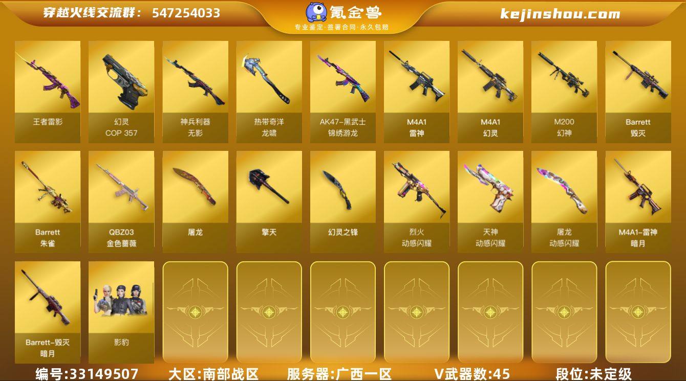 广西一区-46V-3王者武器数-0炫金武器数 【热门武器】:QBZ03-金色蔷薇,M200-幻神,COP 357-幻灵*2 【王者炫金武器】:王者雷影 【音效卡】:Barrett-碧霄极光音效卡,炼狱-百战金芒-庆典舞曲音效卡 【皮肤】:雷神-暗月,M4A1-再燃火线,毁灭-暗月,毁灭-英雄计划 皮肤,屠龙-惊鸿 皮肤,轻型军用手斧-再燃火线 【角色】:影豹,零·纪元,奇洋探员,乔伊教练,云海玲珑,葵-阿尔法武装,暗夜-X,飞虎队-X,风暴女*2,虎妞,嘉年华灵狐,娟娟,灵狐者-黄金海岸,灵狐者-七夕宝贝,曼陀罗-X,潘多拉-X,斯沃特-X,铁骑荣耀,兔囡囡,新娜塔莎,游珑儿,潘多拉-N 【人偶武器】:AWM-灵狐-15周年嘉年华*3,迷你深渊冰龙,迷你牛魔王,迷你波特博士,夺魂,迷你牛牛,深渊终结者手雷,迷你巨石泰坦-魔花研究所 【暴走生化】:超级对讲机 【挑战大师】:机甲撕裂者III,神圣爆裂者-末日III 【英雄级武器】:M4A1-雷神,M4A1-幻灵,QBZ03-金色蔷薇,无影-神兵利器,黑武士-锦绣游龙,烈火-动感闪耀,王者之鲨-觉醒版,王者火魄-觉醒版,机械迷城-穹宇,Barrett-毁灭,M200-幻神,Barrett-朱雀,炼狱-百战金芒,COP 357-幻灵*2,天神-动感闪耀,屠龙*2,擎天,幻灵之锋,屠龙-动感闪...