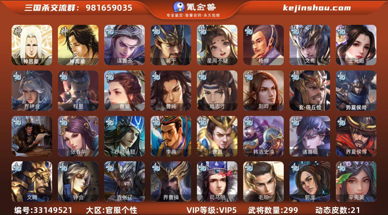 官阶:骠骑将军;VIP等级:VIP5;史诗武将数量:28;动态皮肤数量:21;武将总数:299;史诗宝珠数量:0;将魂数量:1251;神将:0;魏国史诗武将:12;蜀国史诗武将:6;吴国史诗武将:4;群史诗武将:8