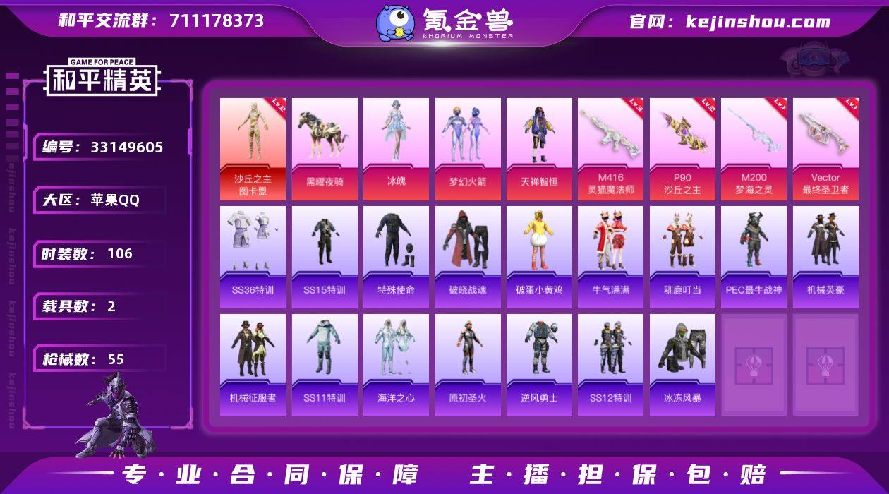 2载具-26套装-55枪皮-1红装2载具3粉装5特效枪6热门26套装55枪皮 23048热力值 2印记 历史传奇王牌11星 【1红装】 沙丘之主-图卡盟 (2级) 【2载具】 暮色幽蹄 黑曜夜骑 【3粉装】 冰魄 梦幻火箭 天禅智恒 【5特效枪】 M416-灵猫魔法师 (3级) P90-沙丘之主 (2级) Vector-最终圣卫者 (1级) M200-梦海之灵 (1级) Mk14-福马献瑞 (2级) 【6热门】 海洋之心 机械英豪 破蛋小黄鸡 M249-古堡领主 Kar98K-古堡领主 M24-香水柠檬 【2飞行器】 梦幻火箭飞行器 幻海精灵飞行器 【2头盔】 梦幻火箭头盔 马卡龙头盔 【3背包】 梦幻火箭背包 幻影战神背包 古堡领主背包 营地ID: