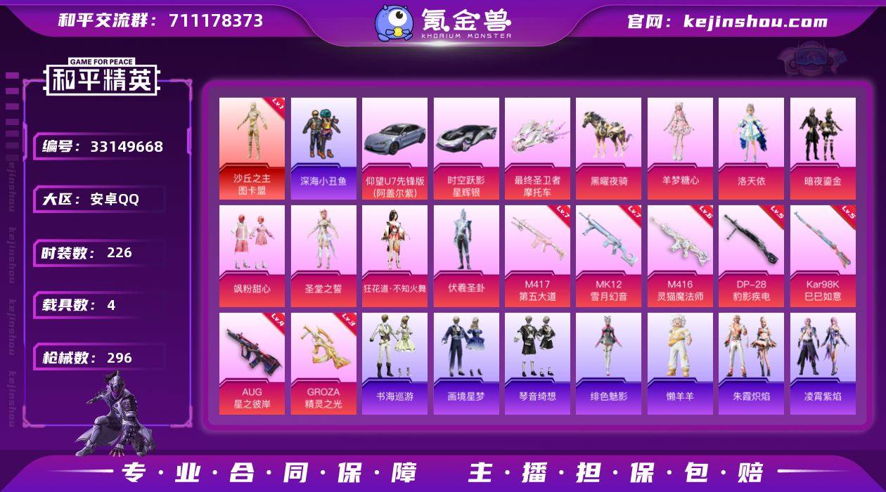 安卓 手Q-1神装-8粉装-10特效枪-4载具-11粉色飞行器-102222热力值-14王牌印记-226套装-296枪皮 【红色神装等级】:沙丘之主-图卡盟(一级) 【红色角色神装】:沙丘之主-图卡盟 【热门品类】:套装-深海小丑鱼,旭日初心兜帽大衣,套装-龟仙人,套装-粉红小猪,角色-Mark.06 【粉色套装】:角色-洛天依,粉装-暗夜鎏金,粉装-飒粉甜心,角色-圣堂之誓,角色-狂花道·不知火舞,角色-伏羲圣卦,角色-羊梦糖心,角色-辉云木星 【粉色枪皮等级】:M416-灵猫魔法师(六级),GROZA-精灵之光(三级),AUG-星之彼岸(四级),UMP45-萌骑冒险(四级),AKS-74U-森灵之息(四级),Kar98K-巳巳如意(五级),Mk14-福马献瑞(五级),M417-第五大道(七级),MK12-雪月幻音(七级),DP-28-豹影疾电(五级) 【粉色载具】:仰望U7(阿盖尔紫),时空跃影(星辉银),最终圣卫者摩托车,黑曜夜骑 【粉色枪皮】:M416-灵猫魔法师,GROZA-精灵之光,AUG-星之彼岸,UMP45-萌骑冒险,AKS-74U-森灵之息,Kar98K-巳巳如意,Mk14-福马献瑞,M417-第五大道,MK12-雪月幻音,DP-28-豹影疾电 【粉色飞行器】:香车宝马飞行器,炫彩糖果飞行器,齐天大圣飞行器,沙丘之主天马,幻海精灵飞行器,曦光华影飞行器,圣域金龙飞...
