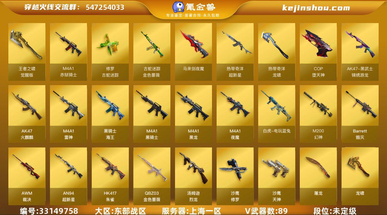 上海一区-94V-4王者武器数-1炫金武器数 【热门武器】:QBZ03-金色蔷薇,HK417-朱雀,M200-幻神,金色蔷薇-古蛇迷踪,修罗-古蛇迷踪,白虎-电玩蓝兔,柯尔特-冠军之特,M4A1-黑骑士,汤姆逊-烈龙,斯泰尔-蝴蝶,火麒麟-绝迹,USP-雷暴,COP-堕天神,沙鹰-修罗*2 【王者炫金武器】:炫金骑士 【音效卡】:屠龙-电竞之星-竞星跃动音效卡,AK47-火麒麟音效卡,Barrett-毁灭音效卡,HK417-朱雀-电竞之星-竞星跃动音效卡,Barrett-碧霄极光音效卡 【皮肤】:幻神-动感闪耀 皮肤,裁决-星际旅行 皮肤,白虎-量子聚变 皮肤,雷神-暗月,雷神-传奇N9,雷神-化蛇 皮肤,火麒麟-平天大圣,毁灭-风暴,毁灭-英雄计划 皮肤,黑龙-能量核心,黑骑士-暗月,战神-粉色甜心皮肤,战神-紫绶金章皮肤,战神-流金岁月皮肤*3,天龙-能量核心 【角色】:葵,凌霄,隼,零·纪元,战地猎狐,不败狙神,王者零-华冠丽服,蛇隐宗,奇洋探员,乔伊教练,修道士,幻面灵狐,斗烈龙骑,暗夜-X,初恋灵狐,风暴女,嘉年华灵狐,娟娟,兰妹妹,龙儿,龙儿-小淘气,曼陀罗-X,潘多拉-X,潘多拉-甜心教官,青霞仙子,蛇姬,蜀雪,兔囡囡,新灵狐者,雪莉杨,游珑儿,职业选手,潘多拉-N,团团 【人偶武器】:火...