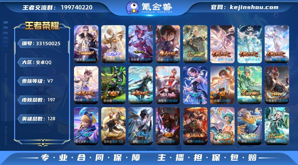安卓Q-V7-最强王者段位-128英雄-197皮肤-1典藏皮肤-1无双-17传说-62史诗个性按键多多 【英雄全皮】:孙权全皮,敖隐全皮,影全皮 【荣耀典藏】:诸葛亮星域神启 【无双皮肤】:孙悟空无相 【传说皮肤】:云缨神骥越千峰,后羿神树通天,杨玉环星之鸣奏,女娲愿照千秋盛,妲己愿照众生和,虞姬愿照岁时盈,云缨幻光神枪,桑启鸣野蒿,孙尚香乘龙问璇玑,赵云乘龙铭钟鼎,马可波罗妄想实况,铠绛天战甲,干将莫邪久胜战神,虞姬云霓雀翎,花木兰冠军飞将,诸葛亮武陵仙君,孙尚香末日机甲 【限定皮肤】:暃埋骨钱,狄仁杰阴阳师,赵云皇家上将,嬴政优雅恋人,芈月白晶晶,元歌无心,马可波罗山海玄木吟,马可波罗妄想实况,狄仁杰魔术师,项羽海滩派对,孙悟空至尊宝,诸葛亮武陵仙君,百里玄策原初追逐者,公孙离蜜橘之夏,鬼谷子天穹祈灯,伽罗琥珀纪元,孙尚香乘龙问璇玑,赵云乘龙铭钟鼎,沈梦溪龙舞盛年,鲁班七号蔬乡物语,李元芳蔬乡物语,刘邦剑破天穹,上官婉儿群星魔术团,程咬金群星魔术团,镜青焰无极,项羽苍威无极,刘备异域游侠,周瑜熔金海岸 【年限皮肤】:马可波罗山海玄木吟,孙尚香乘龙问璇玑,赵云乘龙铭钟鼎,女娲愿照千秋盛,妲己愿照众生和,虞姬愿照...
