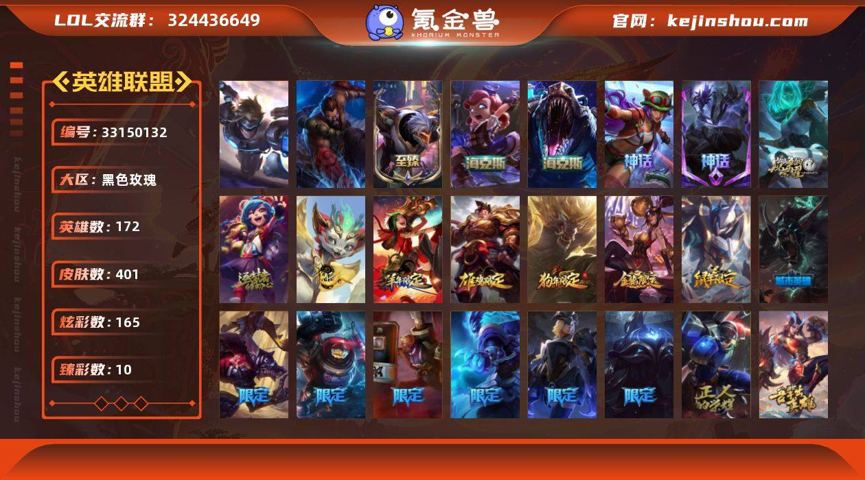未定级段位-172英雄-401皮肤-165炫彩-2终极-8神话-52限定-34传说-99史诗 【热门头像】:爱意绵绵头像 【神话皮肤】:十周年纪念安妮,源代码乐芙兰,十五周年纪念希维尔,神凰行者瑞羽圣凰艾尼维亚,灰烬杀手塞拉斯 【至臻皮肤】:至臻源计划阴劫 【海克斯皮肤】:海克斯科技安妮,海克斯科技雷克顿 【臻彩皮肤】:天龙之子卡莎飞龙乘云,无畏骑士瑟庄妮赤子初心,冠军之箭艾希凯旋圣装,冠军之隐劫凯旋圣装,斗魂觉醒拉克丝无限斗志,战斗学院卡特琳娜盛典礼服,可爱可爱粉红红布里茨,魔女阿卡丽虚荣,净雪之月莫甘娜冬虹 【年限皮肤】:碧玉之牙卡西奥佩娅,神龙烈焰金克丝,张辽文远,南天之怒沃里克,烈焰美人薇恩,王国机神苍狼瑟提,天龙之子斯莫德 【冰雪限定】:圣诞狂欢基兰,邪恶圣诞老人维迦,冰雪驯鹿波比,圣诞老人古拉加斯,圣诞驯鹿克格莫,魄罗骑士瑟庄妮 【终极皮肤】:灵魂守卫乌迪尔,未来战士伊泽瑞尔 【限定皮肤】:冠军典狱长锤石,冠军之血希瓦娜,冠军之隐劫,Fnatic库奇,暗杀星蒙多,暗杀星努努和威朗普,SKTT1劫,SKTT1婕拉,SKTT1李青,SSW图奇,SSW泰隆,SKTT1烬,iG卡莎,FPX普朗克,暗裔英雄盖伦,胜利之树茂凯,胜利枪神格雷福斯,胜利女神...