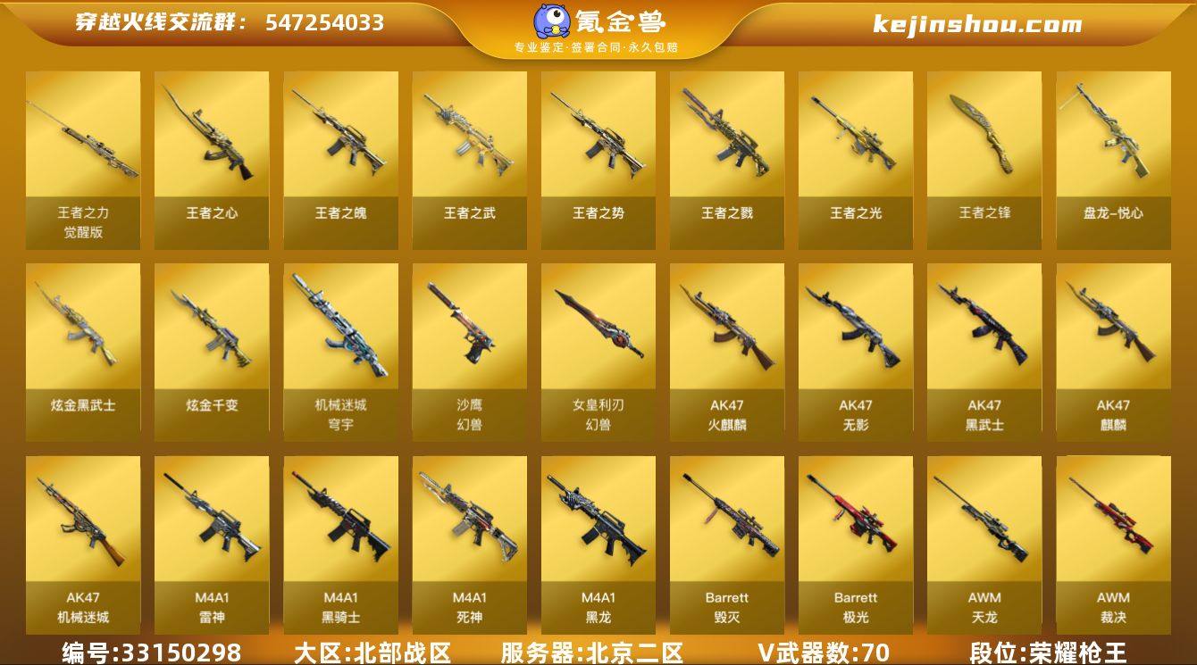 【ky6846】北京二区-74V-11王者武器数-2炫金武器数 【热门武器】:QBZ03-金色蔷薇,C.A.T,M4A1-黑骑士,汤姆逊-烈龙*5,加特林-炼狱*2,沙鹰-修罗*4,高爆手雷-幻兽 【王者炫金武器】:王者之戮,王者之势,王者之武,王者之魄,王者之心,王者之光,盘龙-悦心*3,王者之锋,炫金千变,炫金武士 【音效卡】:屠龙-电竞之星-竞星跃动音效卡,AK47-火麒麟音效卡,M4A1-黑骑士音效卡,Barrett-毁灭音效卡,Barrett-碧霄极光音效卡 【皮肤】:裁决-星际旅行 皮肤,雷神-暗月,雷神-能量核心,雷神-蓝风铃 皮肤,火麒麟-轻羽皮肤,毁灭耀金皮肤,毁灭-英雄计划 皮肤,黑龙-能量核心,黑骑士-暗月,无影-能量核心*2,战神-粉色甜心皮肤*2,战神-紫绶金章皮肤*4,战神-流金岁月皮肤*4,天龙-秘银,AWM-天龙-传奇70KG,极光-能量核心,修罗-能量核心*3,天神-暗月*2,屠龙-春桃 皮肤,屠龙-惊鸿 皮肤,龙啸-醒狮 皮肤,龙啸-青青莓果 皮肤 【角色】:葵,樱,零·纪元,云海玲珑,幻面灵狐,斗烈龙骑,暗夜-X,芳心审判者,风暴女,娟娟,兰-新年限定,兰妹妹,灵狐者-X,灵狐者-黄金海岸,龙儿,潘多拉-X,潘多拉-甜心教官,潜龙队-X,青霞仙子,蜀雪,铁骑荣耀,兔囡囡,樱-缤纷夏日...