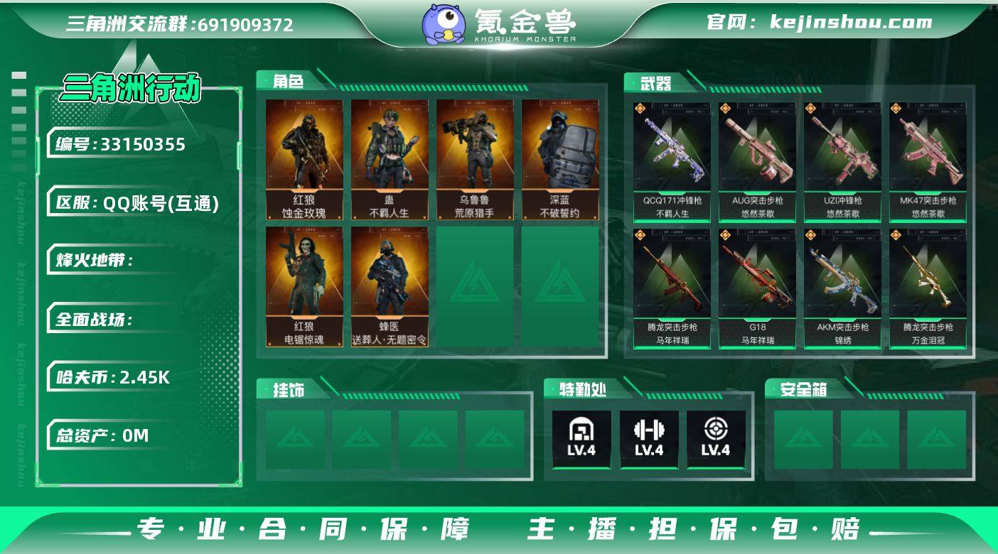 137m总资产-2455k哈夫币-60烽火等级-黑鹰-21战场等级-上等兵 【干员外观】:红狼-蚀金玫瑰,蜂医-送葬人·无题密令,深蓝-不破誓约,红狼-电锯惊魂,乌鲁鲁-荒原猎手,蛊-不羁人生 【近战皮肤】:近战-暗星,近战-处刑者4级,近战-黑鹰 【传说外观】:M4A1突击步枪-蚀金玫瑰,M4A1突击步枪-阿米娅,AKM突击步枪-锦绣,ASh-12战斗步枪-鹅鸭杀,K416突击步枪-行动记录,AUG突击步枪-悠然茶歇,AK-12突击步枪-特斯拉线圈,SCAR-H战斗步枪-启航,G3战斗步枪-骑士,CAR-15突击步枪-阿米娅,腾龙突击步枪-捞点薯条,腾龙突击步枪-马年祥瑞,腾龙突击步枪-万金泪冠,K437突击步枪-锦绣,KC17突击步枪-电锯惊魂,MK47突击步枪-悠然茶歇,MK47突击步枪-暗星,UZI冲锋枪-特斯拉线圈,UZI冲锋枪-悠然茶歇,SMG-45冲锋枪-锦绣,SR-3M紧凑突击步枪-特斯拉线圈,SR-3M紧凑突击步枪-暗星,勇士冲锋枪-能天使-午夜邮差,勇士冲锋枪-万金泪冠,QCQ171冲锋枪-鹅鸭杀,QCQ171冲锋枪-不羁人生,725双管霰弹枪-送葬人-无题密令,M250通用机枪-骑士之心,QJB201轻机枪-鹅鸭杀,M14射手步枪-蛮荒,M14射手步枪-缄花,SKS射手步枪-骑士,SR-25射手步枪-缄花,AWM狙击步枪-捞点薯条,AWM狙击步枪-万金泪...