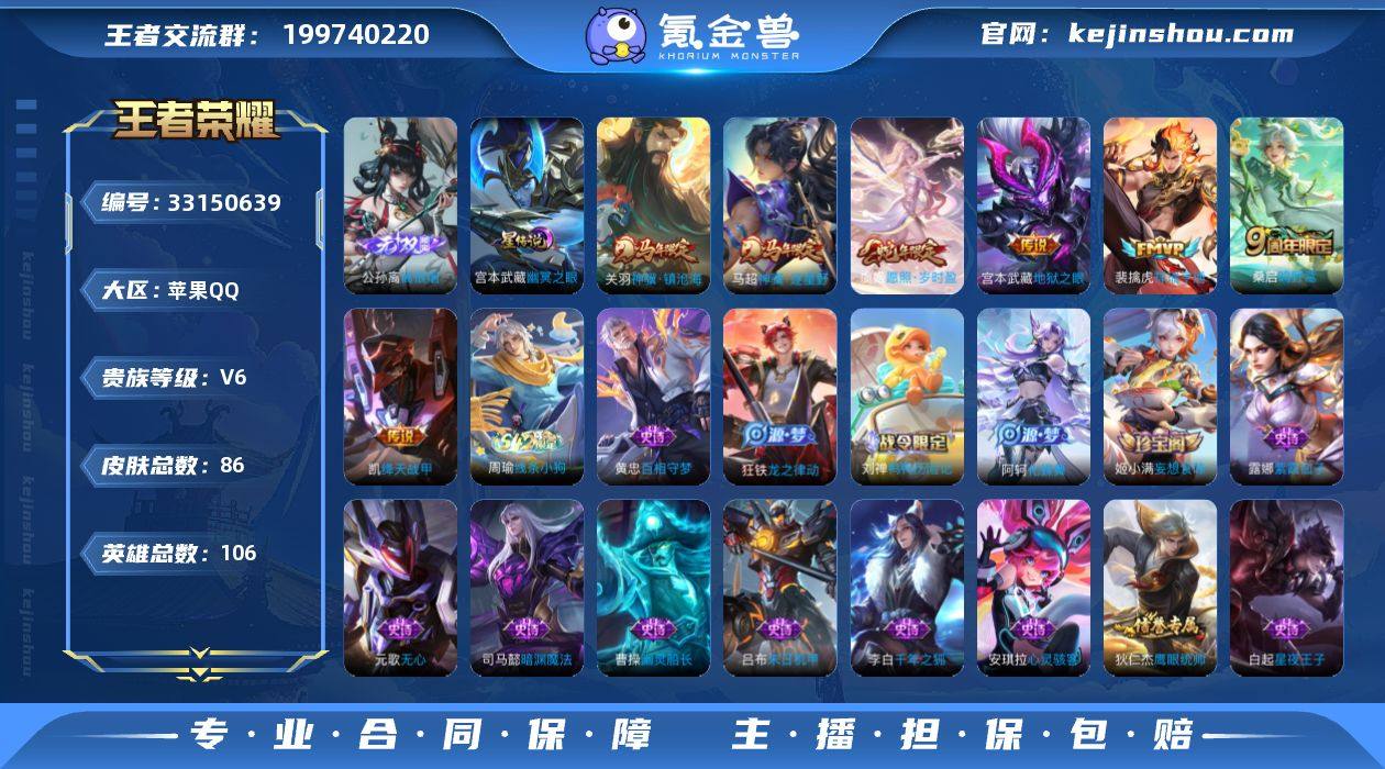 苹果Q-V6-最强王者段位-106英雄-86皮肤-1无双-7传说-21史诗 【无双皮肤】:公孙离离恨烟 【传说皮肤】:关羽神骥镇沧海,马超神骥逐星野,虞姬愿照岁时盈,裴擒虎祥瑞亨通,桑启鸣野蒿,铠绛天战甲,宫本武藏地狱之眼 【限定皮肤】:公孙离离恨烟,姜子牙天穹之誓,狄仁杰阴阳师,赵云皇家上将,元歌无心,狄仁杰魔术师,项羽海滩派对,梦奇顽趣,鬼谷子天穹祈灯,姬小满妄想食味,刘邦剑破天穹 【年限皮肤】:虞姬愿照岁时盈 【赛季限定】:鬼谷子天穹祈灯,刘邦剑破天穹,姜子牙天穹之誓,东皇太一噬灭天穹,太乙真人谧流熔炉,钟馗虚灵犬护,甄姬逆浪荇歌,梦奇顽趣 【战令限定】:刘禅鸭鸭历险记,沈梦溪鸭鸭历险记,周瑜线条小狗 【史诗皮肤】:周瑜线条小狗,黄忠百相守梦,狂铁龙之律动,刘禅鸭鸭历险记,阿轲化蝶舞,姬小满妄想食味,梦奇顽趣,元歌无心,司马懿暗渊魔法,钟馗乐园奇幻夜,狄仁杰鹰眼统帅,白起星夜王子,安琪拉心灵骇客,吕布末日机甲,李白千年之狐,曹操幽灵船长,妲己魅力维加斯,孙尚香水果甜心,宫本武藏鬼剑武藏,狄仁杰魔术师,赵云皇家上将,露娜紫霞仙子 【其他皮肤】:蒙恬苍云破阵,虞姬溯影追猎,艾琳鹤鸣心笺,鬼谷子克喵,莱西奥踏浪...