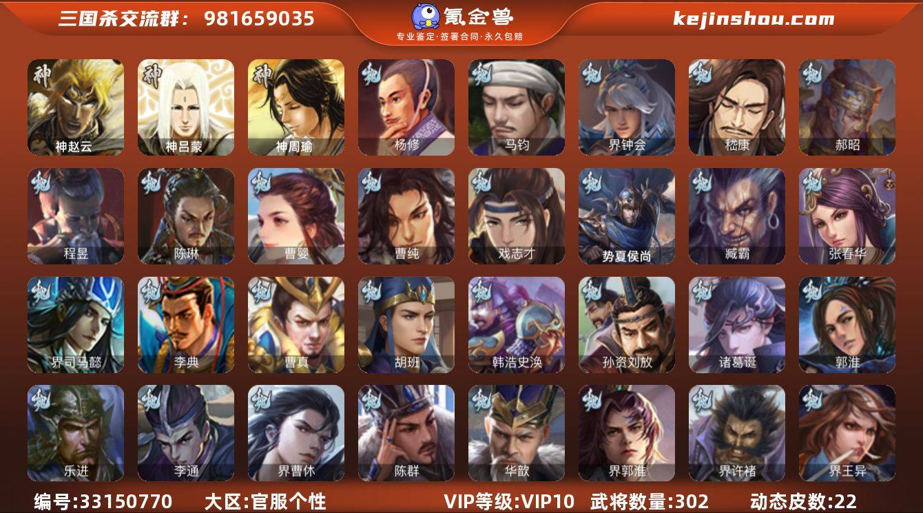 官阶:骠骑将军;VIP等级:VIP10;史诗武将数量:30;动态皮肤数量:22;武将总数:302;史诗宝珠数量:0;将魂数量:2032;神将:1;魏国史诗武将:10;蜀国史诗武将:6;吴国史诗武将:4;群史诗武将:10 神赵云,杨修,马钧,界钟会,嵇康,郝昭,陈琳,曹婴,曹纯,戏志才,程昱,谋诸葛亮,王平,沙摩柯,谯周,花鬘,董允,周处,留赞,界朱然,界徐盛,张让,星甘宁,苏飞,麹义,南华老仙,祢衡,许攸,兀突骨,司马昭,神吕蒙,神周瑜,势夏侯尚,SP关羽,SP蔡文姬,乐进,曹昂,诸葛诞,朱灵,文聘,SP姜维,张春华,钟会,曹冲,郭淮,满宠,界王异,界曹操,界司马懿,界夏侯惇,界张辽,界许褚,界郭嘉,李典,曹真,韩浩史涣,陈群,曹叡,钟繇,司马朗,王基,李通,孙资刘放,界甄姬,鲁芝,界荀彧,杜畿,张恭,界曹植,界满宠,界郭淮,卞夫人,华歆,蔡贞姬,崔琰,毛玠,阮慧,谋徐晃,谋于禁,界曹休,胡班,司马伷,臧霸,唐咨,SP孙尚香,关银屏,夏侯霸,马良,关兴张苞,廖化,界马岱,关平,简雍,刘封,界法正,界关兴张苞,界刘备,界张飞,界马超,SP徐庶,吴懿,周仓,张松,刘谌,夏侯氏,糜竺,李严,黄皓,界黄月英,严颜,界伊籍,界庞统,界姜维,界刘禅,吕凯,张翼,杨仪,傅肜,界简雍,费祎,糜夫人,界周仓,许靖,彭羕,谋庞统,谋黄月英,界张嶷,谋张飞,吴班,诸葛果,糜芳傅士仁,...