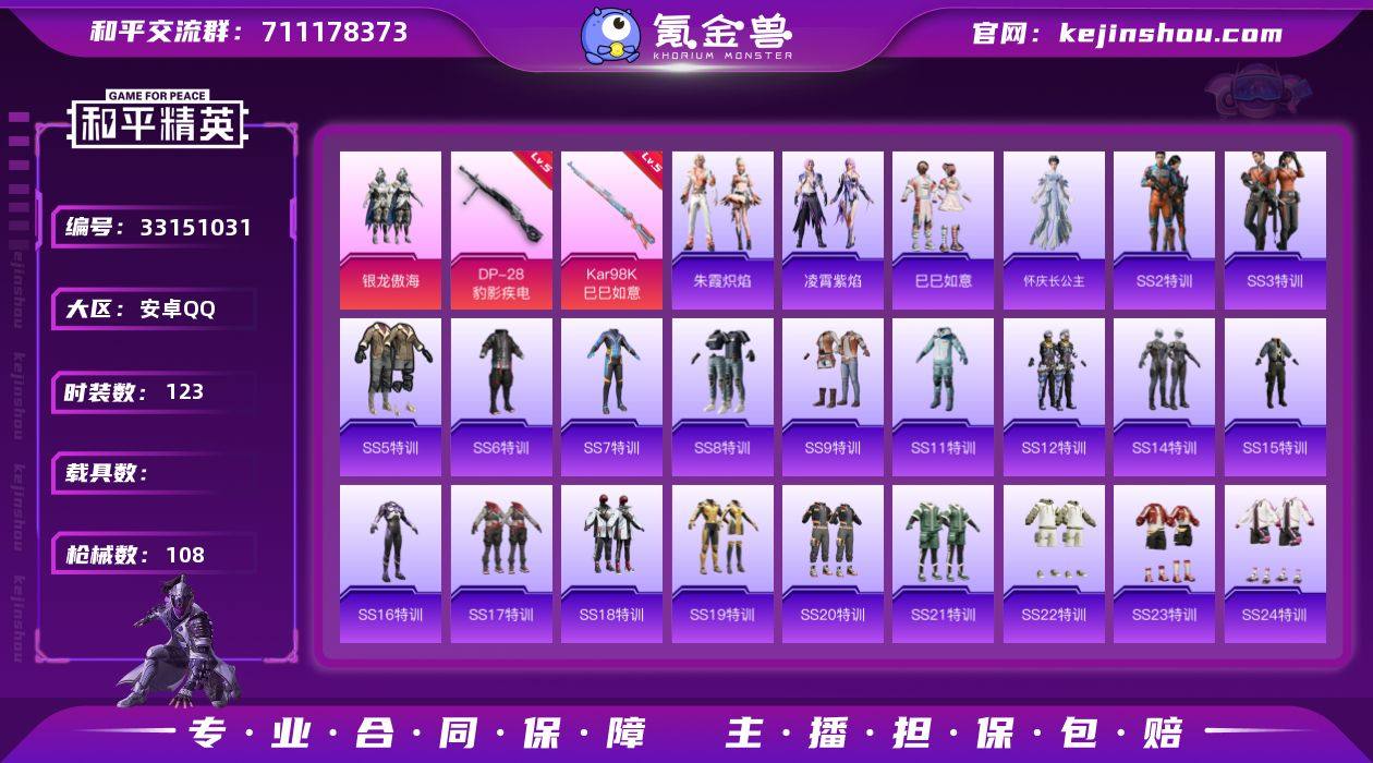 【AZH3544】安卓 手Q【香榭午后 白兰地假日】1粉装-2特效枪-0载具-0粉色飞行器-34111热力值-5王牌印记-123套装-108枪皮 【粉色套装】:粉装-银龙傲海 【粉色枪皮等级】:Kar98K-巳巳如意(五级),DP-28-豹影疾电(五级) 【粉色枪皮】:Kar98K-巳巳如意,DP-28-豹影疾电 【粉色降落伞】:天启纪元降落伞,四圣焕新降落伞,碧影闪光降落伞 【稀有套装】:套装-巳巳如意,角色-怀庆长公主,套装-朱霞炽焰,套装-凌霄紫焰 【稀有枪皮】:AKM-夜灯,AKM-奇异狩猎者,AKM-山经魅狐,AKM-生命誓言,AKM-破晓战魂,AKM-龙的传人,M16A4-幻世战舞者,M16A4-红色方程式,M16A4-蓝色火焰,SCAR-L-玉兔迎春,SCAR-L-红色方程式,M416-糯团青竹,M416-红色方程式,M416-蓝色火焰,GROZA-春暖花开,AUG-耀粉歌者,QBZ-彩虹符号,M762-天降萌叽,M762-牛气冲天,G36C-金风玉露,AC-VAL-天降萌叽,蜜獾-天降萌叽,ARX-凌霄紫焰,UZI-天降萌叽,UZI-炫彩节奏,UZI-红色方程式,UMP45-夜灯,UMP45-生命誓言,UMP45-蓝色火焰,Vector-彩虹符号,Vector-生命誓言,Vector-香水柠檬,Vector-创世·救赎,汤姆逊-天降萌叽,汤姆逊-耀粉歌者,JS9-凌霄紫焰,P90-巳巳如意,Kar98K-彩虹符号,Kar98K-炫彩...