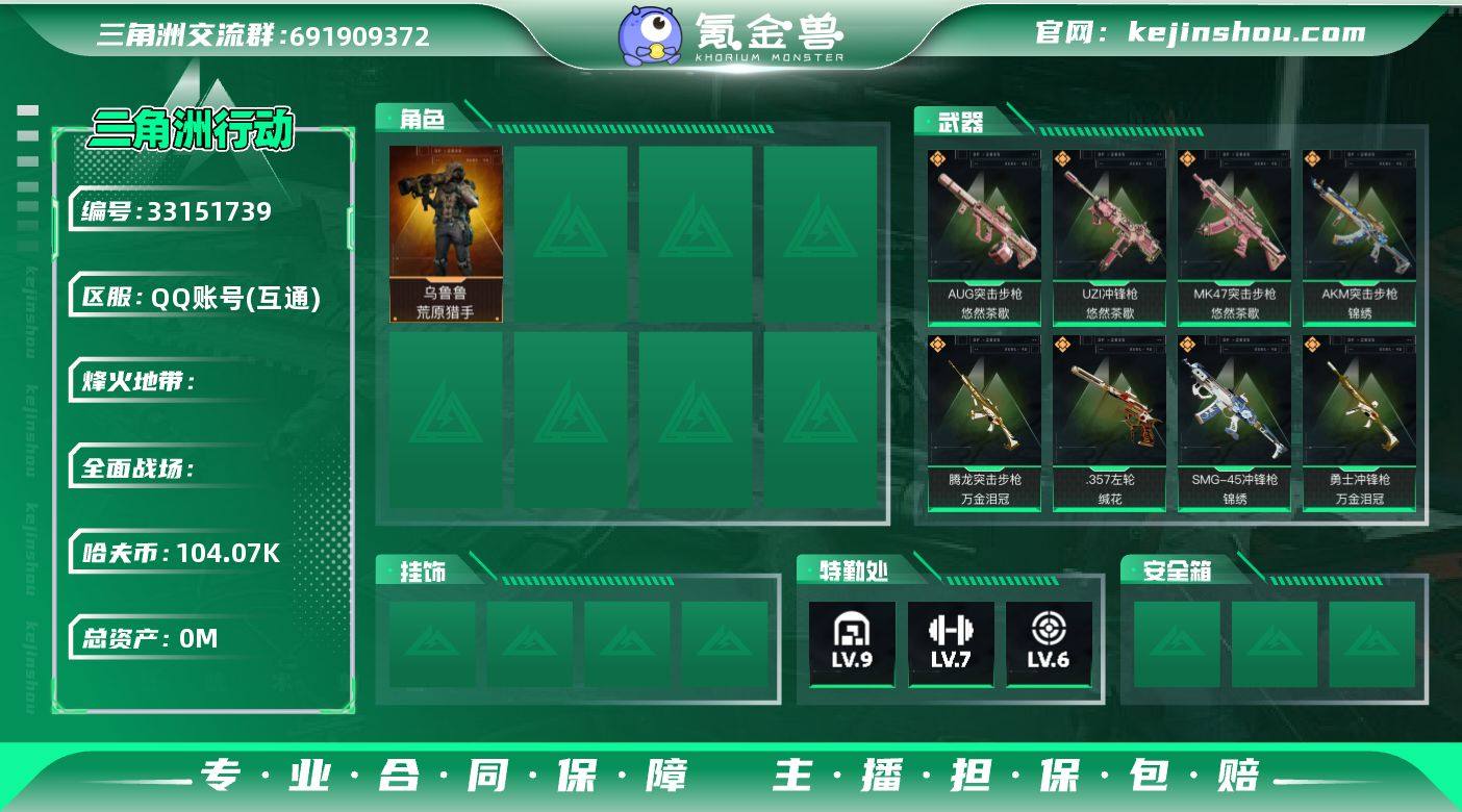 329m总资产-104070k哈夫币-60烽火等级-黑鹰-1战场等级-无军衔 【干员外观】:乌鲁鲁-荒原猎手 【近战皮肤】:近战-暗星,近战-黑鹰 【传说外观】:AKM突击步枪-锦绣,AUG突击步枪-悠然茶歇,腾龙突击步枪-万金泪冠,K437突击步枪-锦绣,MK47突击步枪-悠然茶歇,MK47突击步枪-暗星,UZI冲锋枪-悠然茶歇,SMG-45冲锋枪-锦绣,SR-3M紧凑突击步枪-暗星,勇士冲锋枪-万金泪冠,M14射手步枪-蛮荒,M14射手步枪-缄花,SR-25射手步枪-缄花,AWM狙击步枪-万金泪冠,.357左轮-缄花 【史诗外观】:K416突击步枪-腊梅,K437突击步枪-丛影谍踪,SR-3M紧凑突击步枪-开工大吉,勇士冲锋枪-丛影谍踪,MP7冲锋枪-六套之力,M249轻机枪-丛影谍踪,QJB201轻机枪-炽焰,VSS射手步枪-丛影谍踪 【稀有外观】:K416突击步枪-一帆风顺,SG552突击步枪-马年新春,SG552突击步枪-贴花艺术, AK-12突击步枪-马年新春,CAR-15突击步枪-来财,KC17突击步枪-来财,SMG-45冲锋枪-行动开启,SR-3M紧凑突击步枪-马年新春,M249轻机枪-冰天雪地,Mini-14射手步枪-来财 【普通外观】:K416突击步枪-重击,M7战斗步枪-重击,PTR-32突击步枪-典雅,MP5冲锋枪-典雅,UZI冲锋枪-重击,M1014霰弹枪-重击,QJB201轻机枪-...