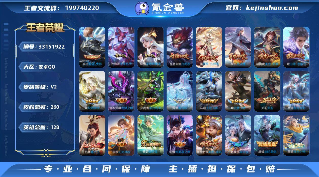 安卓Q-V2-至尊星耀V段位-128英雄-260皮肤-1典藏皮肤-20传说-89史诗 【荣耀典藏】:李白鸣剑曳影 【传说皮肤】:澜愿照九州拓,云缨幻光神枪,桑启鸣野蒿,吕布曦玄引,露娜霜月吟,干将莫邪画中仙,曜山海苍雷引,马超无双飞将,裴擒虎寅虎赤拳,鲁班七号寅虎瑞焰,西施游龙清影,镜炽阳神光,虞姬启明星使,关羽武圣,曜云鹰飞将,百里玄策白虎志,貂蝉仲夏夜之梦,李白凤求凰,孙尚香末日机甲,宫本武藏地狱之眼 【限定皮肤】:暃埋骨钱,蔡文姬夏日便利店,虞姬夏日便利店,姜子牙天穹之誓,狄仁杰阴阳师,廉颇寅虎御盾,赵云皇家上将,赵云百木心枪,嬴政优雅恋人,嬴政白昼王子,孙尚香蔷薇恋人,鲁班七号狮舞东方,鲁班七号寅虎瑞焰,阿轲迷踪丽影,孙膑寅虎展翼,扁鹊奇幻香踪,吕布猎兽之王,周瑜赤莲之焰,元歌云间偶戏,元歌无心,夏侯惇朔风刀,典韦蓝屏警告,马可波罗暗影游猎,狄仁杰魔术师,狄仁杰万华元夜,达摩沙漠行僧,项羽海滩派对,老夫子醍醐杖,关羽武圣,程咬金演武夺筹,刘邦夺宝奇兵,韩信傲雪梅枪,兰陵王驯魔猎人,亚瑟潮玩骑士王,孙悟空至尊宝,孙悟空大圣娶亲,牛魔御旌,后羿如梦令,李元芳云中旅人,虞姬启明星使,钟馗神迹守卫,钟馗驱傩正...