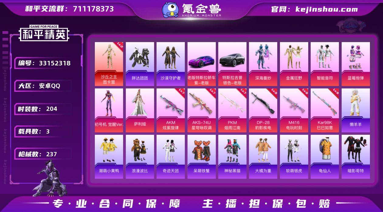 【kyhp1698】安卓 手Q-1神装-6粉装-9特效枪-3载具-4粉色飞行器-85219热力值-10王牌印记-204套装-237枪皮 【红色神装等级】:沙丘之主-图卡盟(二级) 【红色角色神装】:沙丘之主-图卡盟 【热门品类】:套装-胖达团团,套装-沙漠守护者,套装-龟仙人,套装-潮萌小黄鸭,套装-暗影哥特,套装-浪漫波比,套装-粉红小猪,角色-8号机,角色-Mark.06 【粉色套装】:粉装-深海曼妙,粉装-金属狂野,粉装-智能音符,粉装-蓝莓炮弹,角色-初号机 觉醒Ver.,角色-萨利娅 【粉色枪皮等级】:AKM-炫紫旋律(七级),AKM-暮色玫影(三级),M416-电玩时刻(五级),UMP45-萌骑冒险(三级),AKS-74U-星穹咏叹调(七级),Kar98K-巳巳如意(五级),Mk14-福马献瑞(二级),DP-28-豹影疾电(五级),PKM-江南烟雨(七级) 【粉色载具】:特斯拉Model 3(奇幻紫),特斯拉Model X(冷光银),暮色幽蹄 【粉色枪皮】:AKM-炫紫旋律,AKM-暮色玫影,M416-电玩时刻,UMP45-萌骑冒险,AKS-74U-星穹咏叹调,Kar98K-巳巳如意,Mk14-福马献瑞,DP-28-豹影疾电,PKM-江南烟雨 【粉色飞行器】:深海曼妙飞行器,香车宝马飞行器,神秘黑猫飞行器,暮色之舞飞行器 【粉色降落伞】:深海曼妙降落伞,梦幻火箭降落伞,炫紫旋律...