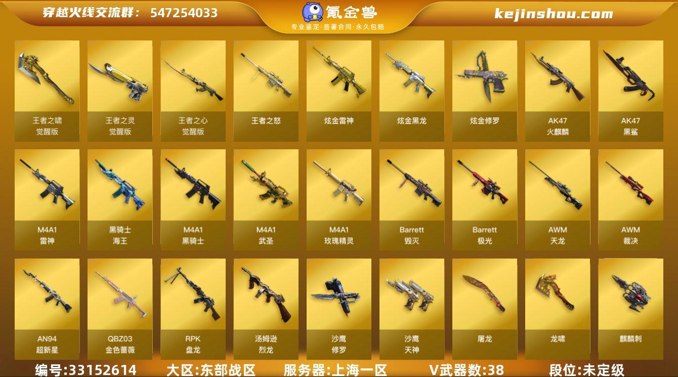 上海一区-41V-4王者-3炫金 【传说角色】:传说星骇 【热门武器】:QBZ03-金色蔷薇,M4A1-黑骑士,汤姆逊-烈龙*6,RPK-盘龙,加特林-炼狱,降世魔童,沙鹰-修罗*4 【王者炫金武器】:王者之怒,炫金黑龙,炫金雷神,炫金修罗 【音效卡】:M4A1-雷神音效卡,Barrett-毁灭音效卡 【皮肤】:裁决-羽掣 皮肤,雷神-暗月,雷神-机甲刑天皮肤,火麒麟-轻羽皮肤,毁灭-暗月,毁灭-CFS2020,毁灭-神秘黑洞皮肤,黑龙-暗月,黑骑士-暗月,黑骑士耀金皮肤,死神-秘银,天启-暗月*3,天龙-能量核心,极光-能量核心,炼狱-奇幻宇宙万象,修罗-能量核心 【角色】:零,葵,樱,乔伊教练,云海玲珑,炽天使,北极狐-X,初恋灵狐,芳心审判者,风暴女*2,零-水下丽影,灵狐者-黄金海岸,曼陀罗-X,萌儿,潘多拉-甜心教官,邱刚敖,青霞仙子,斯沃特-X,蜀雪,铁骑-乘风破浪,铁骑荣耀,兔囡囡,维纳斯,新娜塔莎,雪莉杨,影武者-X,智影 【人偶武器】:火麒麟-灵狐,巴雷特-零-水下丽影,M37-葵,迷你深渊冰龙,夺魂*2,迷你生化手雷,深渊终结者手雷,迷你艾比,迷你巨石泰坦-魔花研究所,降世魔童 【挑战大师】:火狱乱世-超越Max,AK47-冰龙粉碎者,激光毁灭者III,KAC-圣炎切割者III,神...
