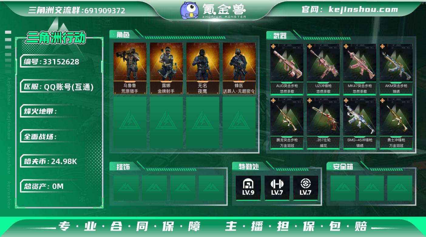 341m总资产-24985k哈夫币-60烽火等级-黑鹰-15战场等级-列兵 【干员外观】:蜂医-送葬人·无题密令,无名-夜鹰,露娜-金牌射手,乌鲁鲁-荒原猎手 【近战皮肤】:近战-暗星,近战-信条,近战-处刑者1级,近战-黑鹰 【传说外观】:M4A1突击步枪-阿米娅,AKM突击步枪-锦绣,ASh-12战斗步枪-鹅鸭杀,AUG突击步枪-悠然茶歇,M7战斗步枪-零度协议,SG552突击步枪-运动员,AK-12突击步枪-夜鹰,AK-12突击步枪-特斯拉线圈,SCAR-H战斗步枪-启航,CAR-15突击步枪-黑鹰坠落,CAR-15突击步枪-阿米娅,腾龙突击步枪-捞点薯条,腾龙突击步枪-万金泪冠,K437突击步枪-锦绣,MK47突击步枪-悠然茶歇,MK47突击步枪-暗星,P90冲锋枪-信条,UZI冲锋枪-特斯拉线圈,UZI冲锋枪-悠然茶歇,SMG-45冲锋枪-骑士,SMG-45冲锋枪-锦绣,SR-3M紧凑突击步枪-特斯拉线圈,SR-3M紧凑突击步枪-暗星,勇士冲锋枪-能天使-午夜邮差,勇士冲锋枪-万金泪冠,QCQ171冲锋枪-鹅鸭杀,725双管霰弹枪-送葬人-无题密令,M250通用机枪-骑士之心,QJB201轻机枪-鹅鸭杀,M14射手步枪-蛮荒,M14射手步枪-缄花,SR-25射手步枪-信条,SR-25射手步枪-缄花,AWM狙击步枪-捞点薯条,AWM狙击步枪-万金泪冠,.357左轮-缄花,93R-捞点薯...