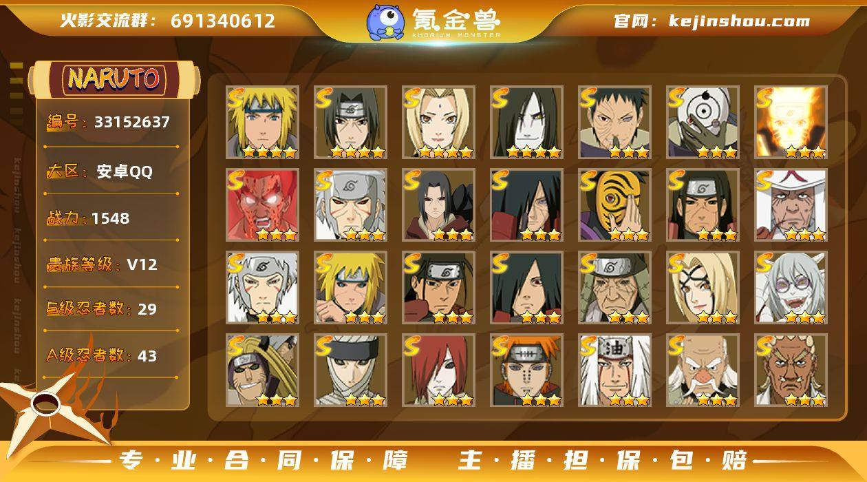 【HYZ3076】V12/战力1548W/S忍29/A忍43/三星S-宇智波斑「秽土转生」/二星A-波风水门「新春限定」/三星S-纲手「百豪」/二星A-照美冥「夏日泳装」/二星A-达鲁伊「五代目雷影」/五星A-我爱罗「疾风传」/三星S-无「二代目土影」/二星A-宇智波止水/五星A-猿飞阿斯玛/五星A-蝎/五星A-飞段/三星S-宇智波斑/三星S-猿飞日斩「秽土转生」/三星S-千手扉间/二星A-猿飞阿斯玛「秽土转生」/五星A-迈特凯/二星A-宇智波鼬「新春限定」/三星S-自来也/三星S-千手扉间「秽土转生」/三星S-药师兜「仙人模式」/二星A-长十郎「六代目水影」/三星S-宇智波斑「白面具」/四星S-纲手/三星S-迈特凯「死门」/三星S-千手柱间/三星S-猿飞日斩/二星A-宇智波带土「暴怒」/二星A-黑土「四代目土影」/三星A-宇智波鼬/二星A-迪达拉「秽土转生」/二星A-药师兜「半蛇斗篷」/二星A-宇智波佐助「万花筒写轮眼」/二星A-我爱罗「忍界大战」/二星A-迪达拉/三星A-漩涡鸣人「九尾查克拉」/二星A-小南/四星A-飞段「死司凭血」/二星A-不缘/二星A-猿飞木叶丸「博人传」/三星S-神秘面具男/二星A-大蛇丸「晓」/三星S-金角/银角「秽土转生」/四星S-大蛇丸/三星S-宇智波鼬「秽土转生」/二星A-长门「青年」/三星S-宇智波带土 「忍界...