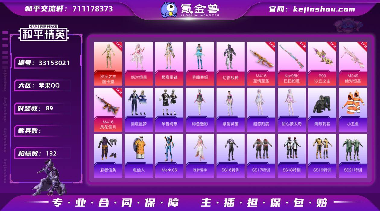 【kyhp1694】苹果 手Q-1神装-4粉装-5特效枪-0载具-3粉色飞行器-50561热力值-9王牌印记-89套装-132枪皮 【红色神装等级】:沙丘之主-图卡盟(五级) 【红色角色神装】:沙丘之主-图卡盟 【热门品类】:套装-小丑鱼,套装-忍者信条,套装-龟仙人,角色-Mark.06 【粉色套装】:角色-绝对恒星,粉装-幻影战神,角色-异瞳寒姬,粉装-极意拳锋 【粉色枪皮等级】:M416-风花雪月(二级),M416-至情至圣(九级),P90-沙丘之主(三级),Kar98K-巳巳如意(五级),M249-绝对恒星(二级) 【粉色枪皮】:M416-风花雪月,M416-至情至圣,P90-沙丘之主,Kar98K-巳巳如意,M249-绝对恒星 【粉色飞行器】:绝对恒星飞行器,炫彩糖果飞行器,沙丘之主天马 【粉色降落伞】:绝对恒星降落伞,百万伏特降落伞,圣堂之誓降落伞,沙丘之主降落伞,江南烟雨降落伞,异瞳寒姬降落伞,炫彩糖果降落伞 【稀有套装】:套装-龟仙人,角色-超感刻度,角色-甜心蒙太奇,套装-炫彩糖果,角色-瑰梦爱神,角色-绯色魅影,角色-紫俏灵猫,套装-画境星梦,套装-琴音绮想 【稀有枪皮】:AUG-冰晶雪宝,AKM-彩虹符号,AKM-影袭,AKM-缤纷海域,AKM-虎虎生威,AKM-霓虹街区,AKM-龙的传人,SCAR-L-炫彩节奏,SCAR-L-红色方程...