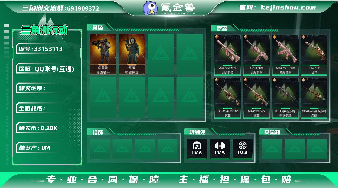 132m总资产-285k哈夫币-60烽火等级-钻石-1战场等级-无军衔 【干员外观】:红狼-电锯惊魂,乌鲁鲁-荒原猎手 【近战皮肤】:近战-暗星,近战-处刑者1级,近战-黑鹰 【传说外观】:M4A1突击步枪-阿米娅,K416突击步枪-行动记录,AUG突击步枪-悠然茶歇,AK-12突击步枪-特斯拉线圈,SCAR-H战斗步枪-启航,腾龙突击步枪-捞点薯条,KC17突击步枪-电锯惊魂,MK47突击步枪-悠然茶歇,UZI冲锋枪-特斯拉线圈,UZI冲锋枪-悠然茶歇,SR-3M紧凑突击步枪-特斯拉线圈,勇士冲锋枪-能天使-午夜邮差,M14射手步枪-蛮荒,M14射手步枪-缄花,SKS射手步枪-骑士,SR-25射手步枪-缄花,AWM狙击步枪-捞点薯条,.357左轮-缄花,93R-捞点薯条,复合弓-黑·天际线 【史诗外观】:AKM突击步枪-林中猎手,QBZ95-1突击步枪-曙光,K416突击步枪-腊梅,M16A4突击步枪-竞赛选手,AUG突击步枪-蝮蛇,AS Val突击步枪-典狱官,K437突击步枪-丛影谍踪,MP5冲锋枪-深海恐惧,MP5冲锋枪-战术竞备,MP5冲锋枪-竞技风,P90冲锋枪-紧急戒备,Vector冲锋枪-猎鳄行动,SR-3M紧凑突击步枪-战术竞备,SR-3M紧凑突击步枪-开工大吉,勇士冲锋枪-深海恐惧,勇士冲锋枪-工业狂潮,勇士冲锋枪-丛影谍踪,MP7冲锋枪-六套之力,M1014...