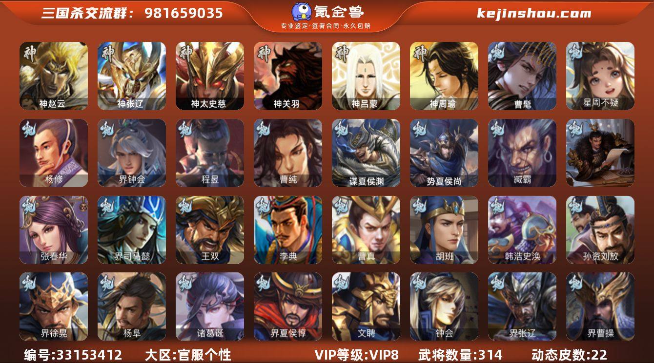 【14790048】官阶:骠骑将军;VIP等级:VIP8;史诗武将数量:22;动态皮肤数量:22;武将总数:314;史诗宝珠数量:12;将魂数量:981;神将:3;魏国史诗武将:12;蜀国史诗武将:6;吴国史诗武将:0;群史诗武将:7