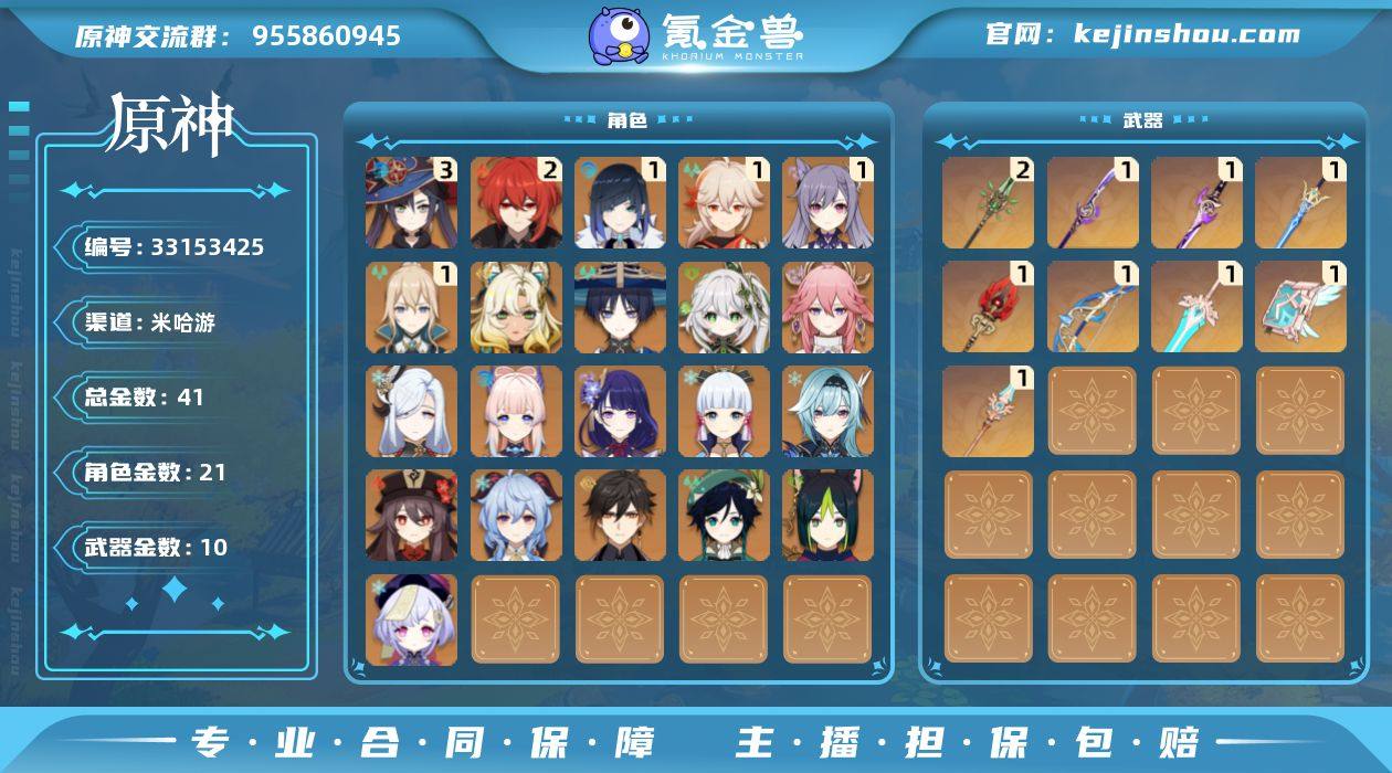 58级/41黄/女主/21个五星角色/10个五星武器 0命流浪者,0命纳西妲,0命提纳里,1命夜兰,0命八重神子,0命申鹤,0命优菈,0命雷电将军,1命枫原万叶,0命神里绫华,0命钟离,0命胡桃,0命甘雨,0命温迪,0命珊瑚宫心海,1命刻晴,0命七七,1命琴,3命莫娜,2命迪卢克,0命希诺宁,精1终末嗟叹之诗,精1薙草之稻光,精1雾切之回光,精1苍古自由之誓,精1护摩之杖,精2和璞鸢,精1天空之脊,精1天空之卷,精1天空之傲